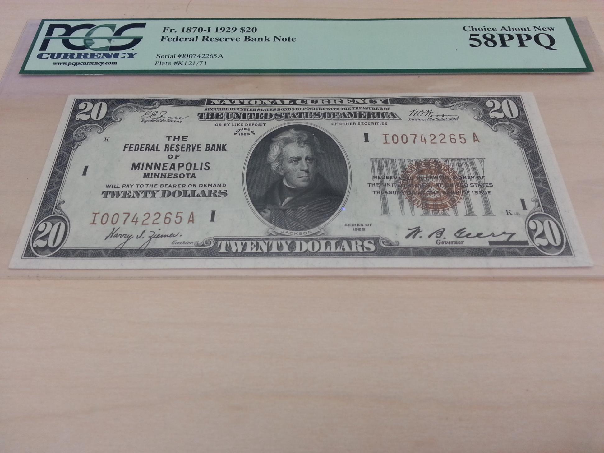 Another addition to the district set of $20 FRBNs in 58 grade. Now we have four districts out of twelve. It's a shame I let a San Francisco slip by at a Heritage auction a few months back. I got into a pretty gruesome bidding war and it got way too expensive. Now we have Minneapolis. I'm afraid of what a Dallas in 58 will do to my bank account.