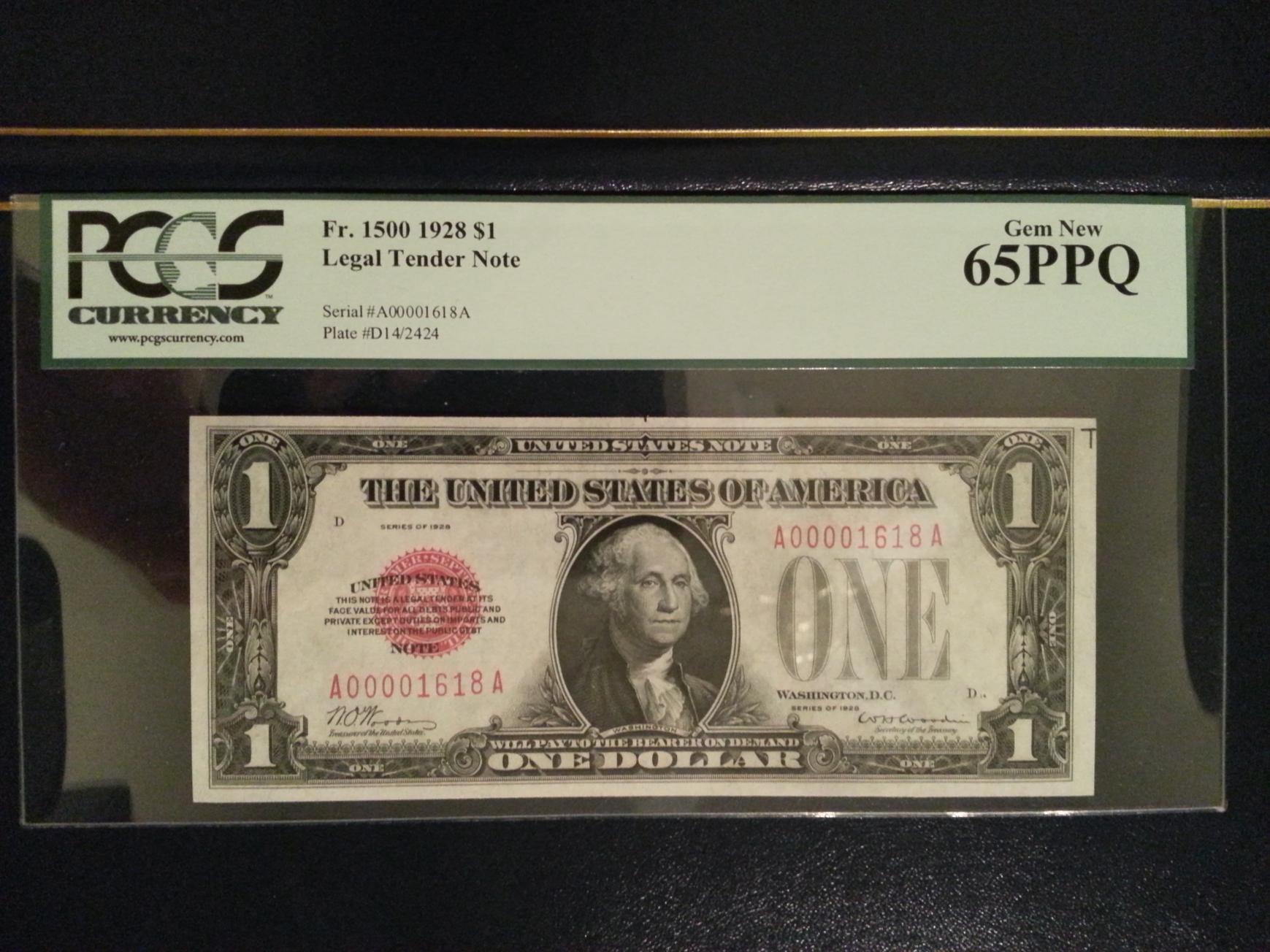 My newest addition: Fr. 1500 - 1928 $1 Legal Tender 65PPQ. Serials under 5,000 carry a nice premium. This was the only range released in the United States. The rest went to Puerto Rico.