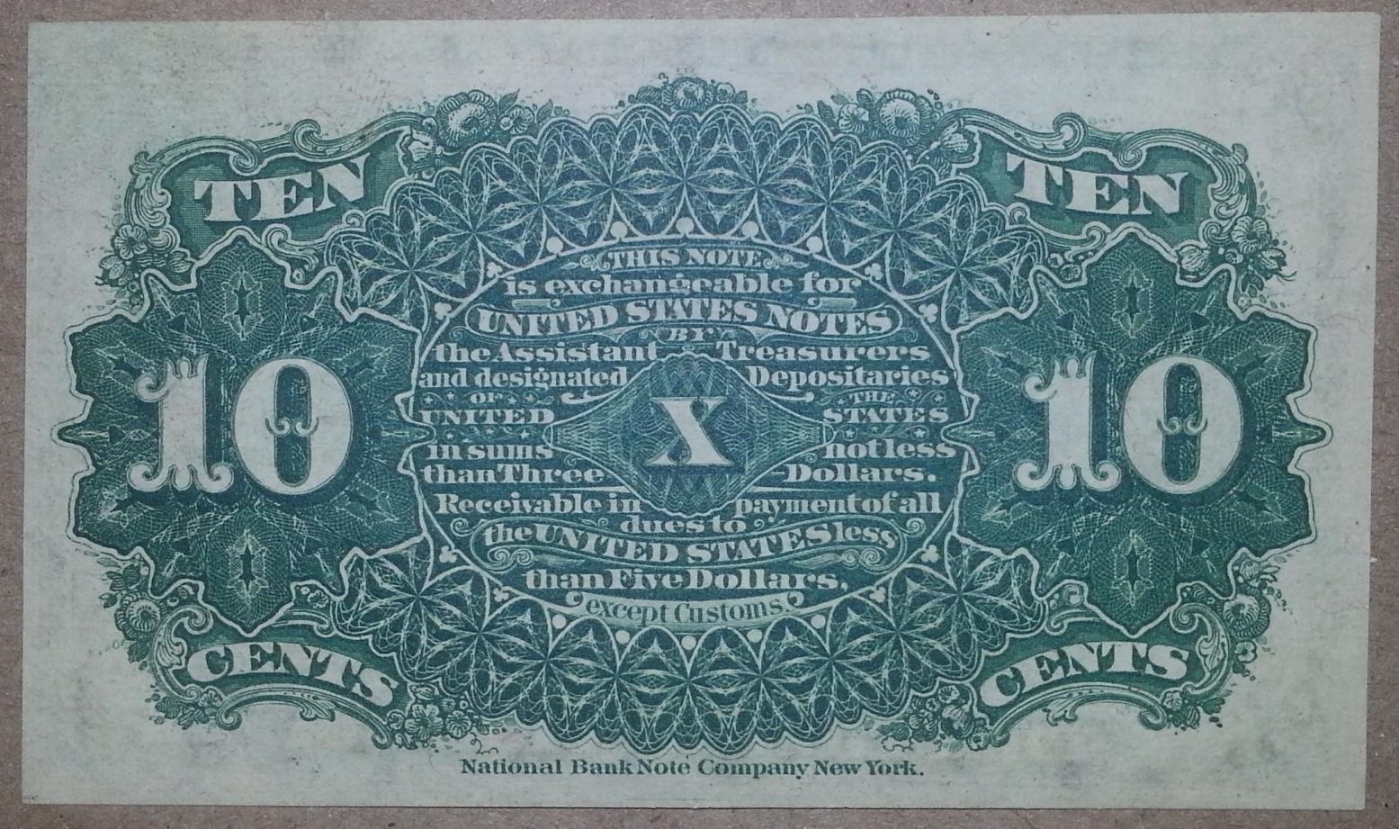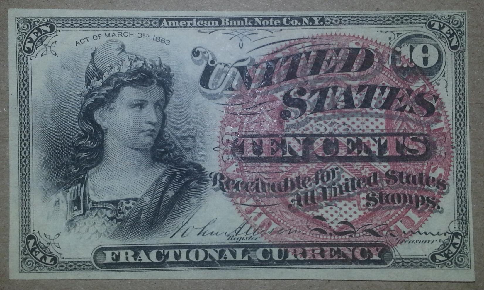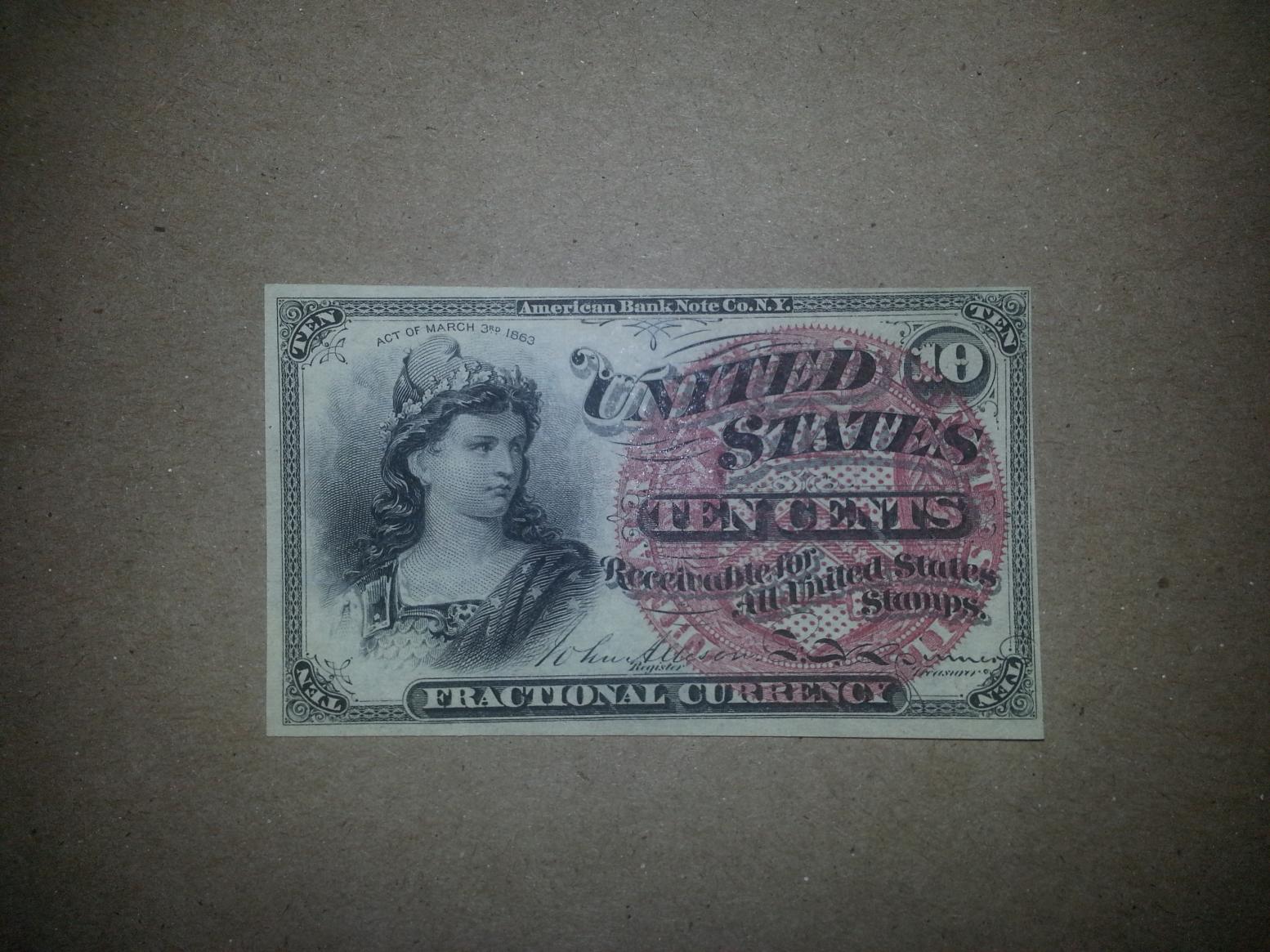 New addition. Fourth Issue 10 cent in choice uncirculated condition. Unfortunately the margins aren't even enough to call it a gem. One of my favorite fractional designs.
