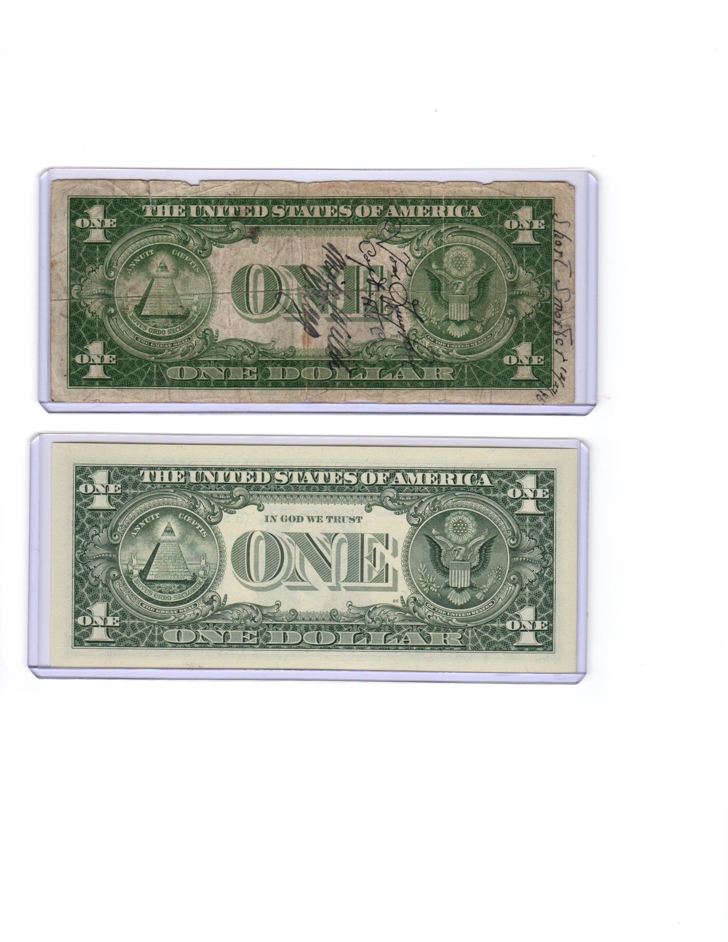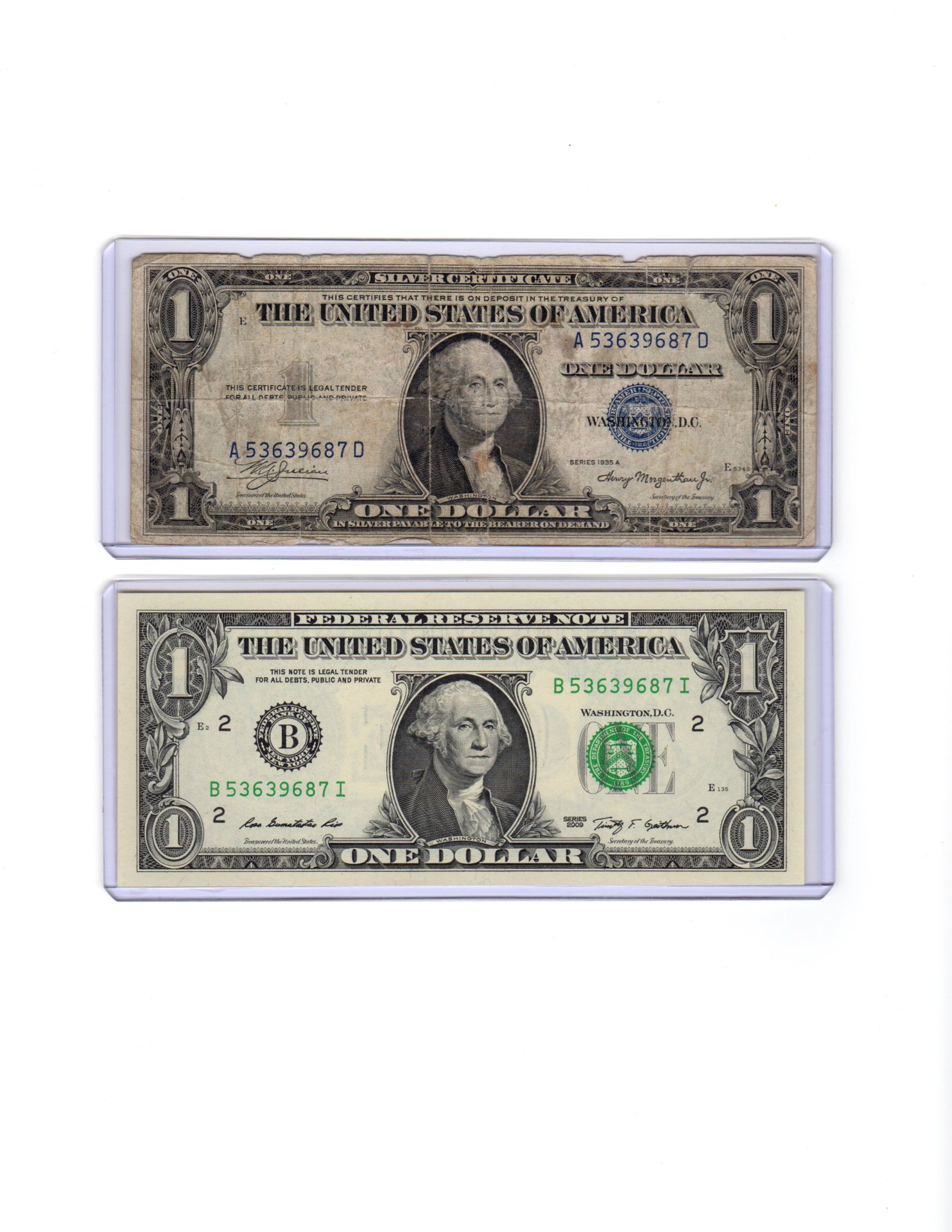 -2009 CU $1 and 1935 $1 with matching serial numbers. The 1935 is a short snorter! Again, not in the greatest condition, but I thought it was an interesting set and bought them.