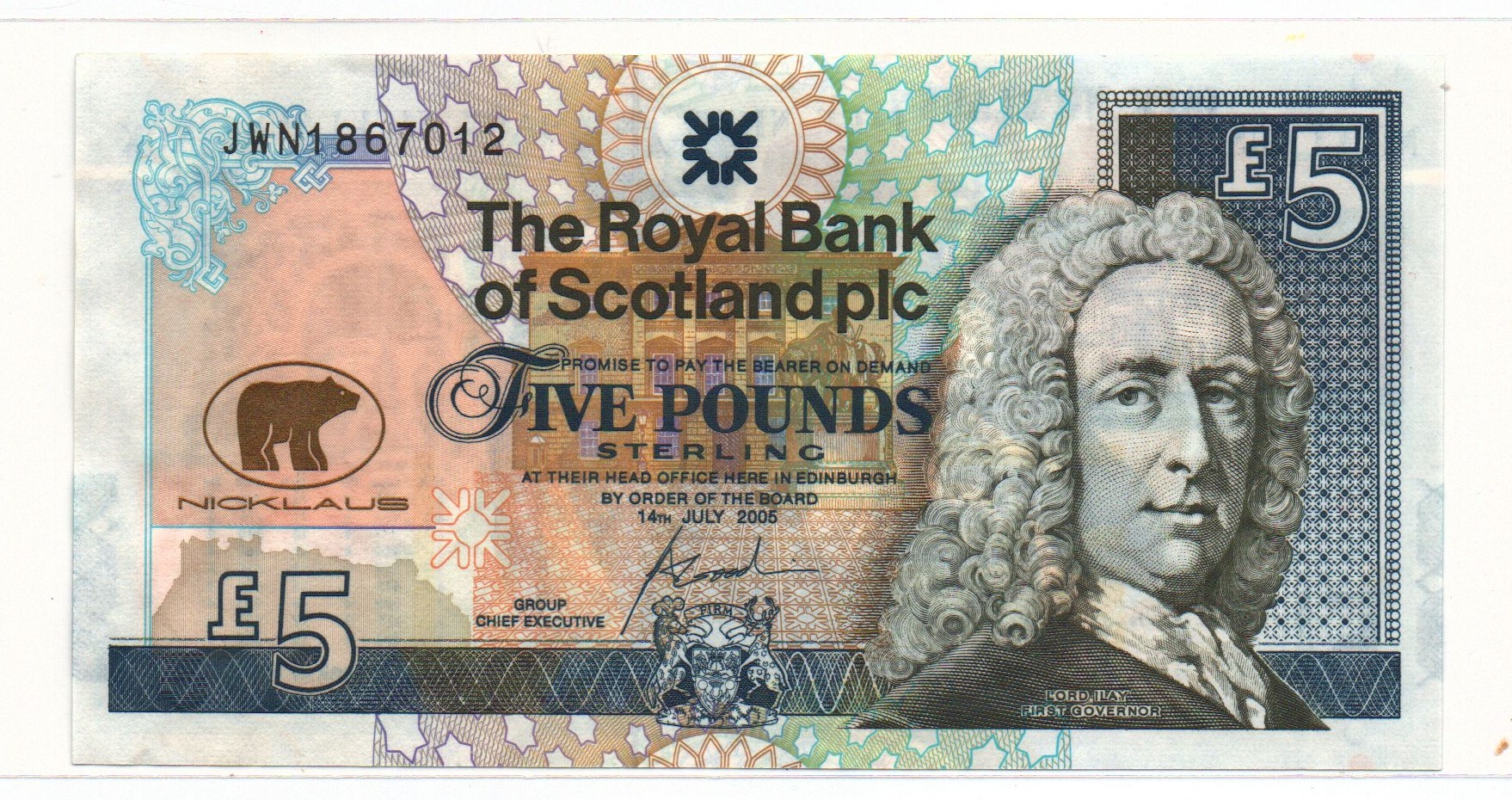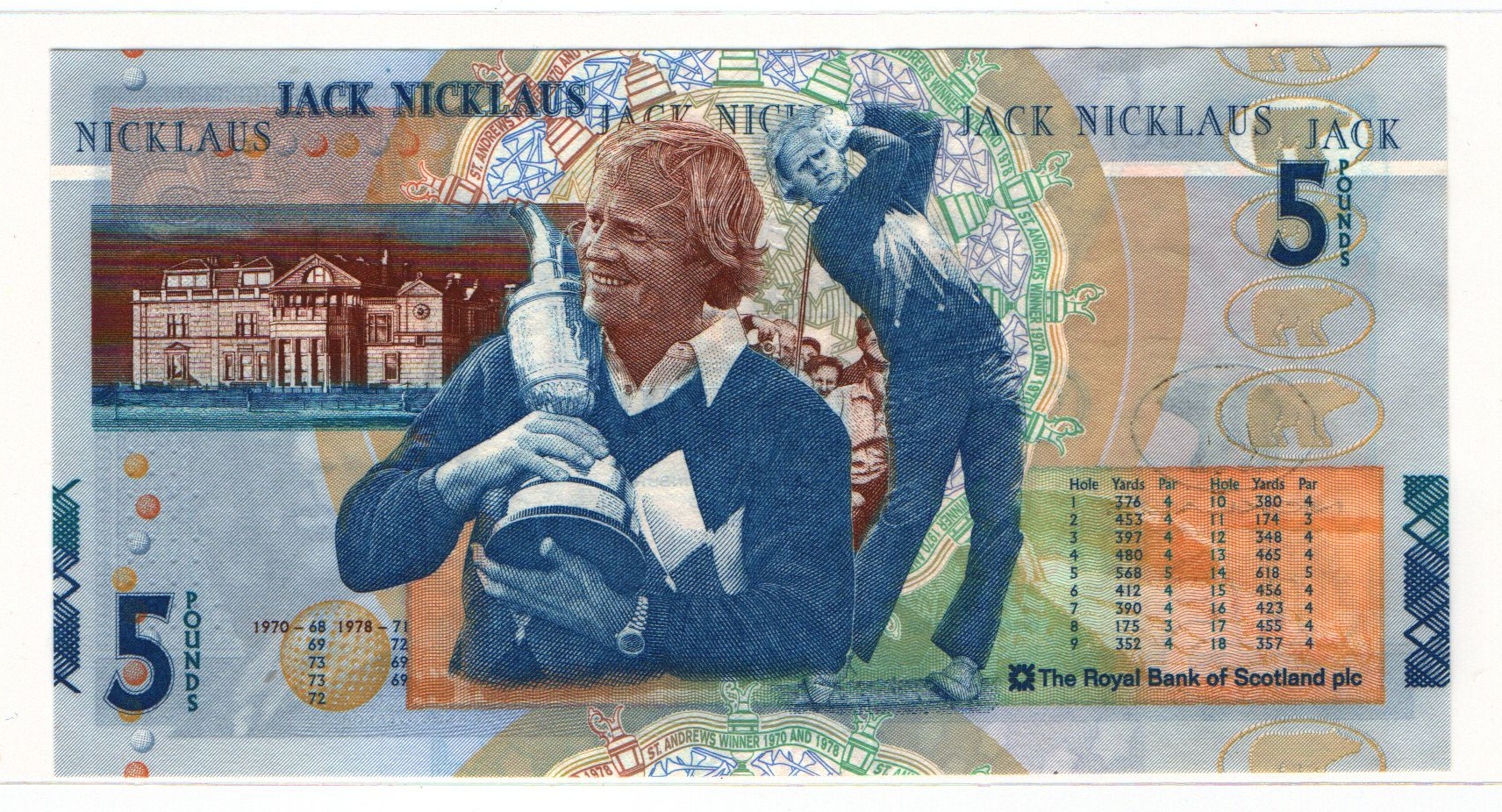 Newest acquisition £5 Scottish Commemorative "Jack Nicklaus" 2006 Came today.... but Its a gift for a friend. Might get one for me. One of the coolest notes under ultra violet light, I've seen. I think if no one else wants to, I am going to start a thread on UV lighted pics of world banknotes.