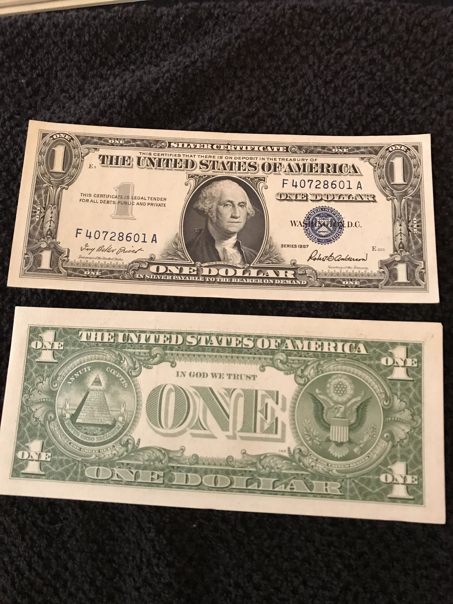 I have about #48 one dollar silver certificates, with sequential serial numbers from 1957. The numbers run from F40728601A to F40728615A skips one, have 8617A, skips one, than have F40728619A to F40728640A. Then have another run from N 16930256A to N16930270A. I have two other bills that are sequential as well. They are in perfect condition, been sitting in an envelope between two cardboard sheets in my Dad's safe for 50 plus years. Are they worth anything more than face value. I am winding my way through a huge coin collection left to me by my Dad, and I am trying to learn as I go. I had never heard of silver certificates until I saw these. Any help would be appreciated.