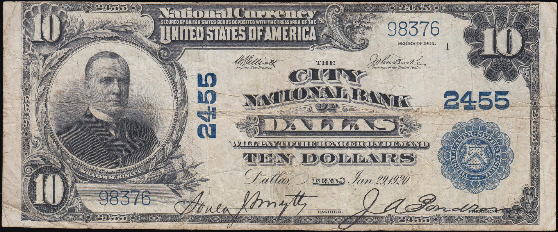 Today's new pickup is this $10 1902 PB national note from the City National Bank of Dallas... as a Dallas collector I love filling in a gap on the nationals list, and this bank is pretty common to be sure, still it's nice to check one off the list...on to the harder conquests as it were.