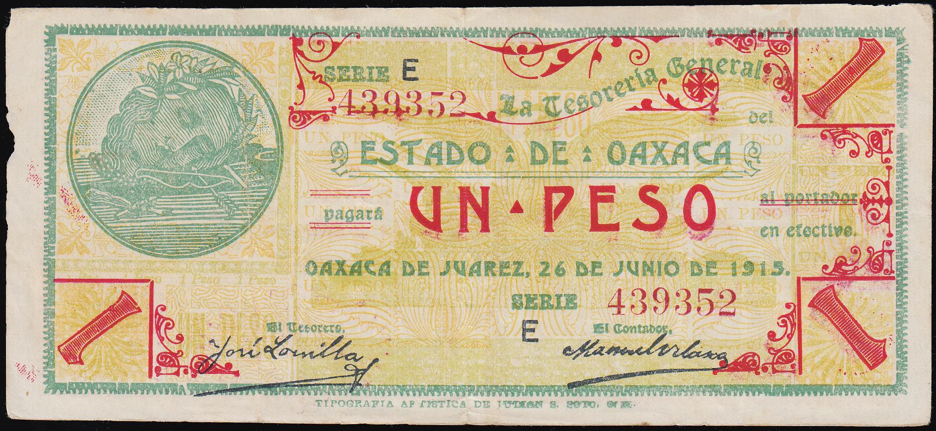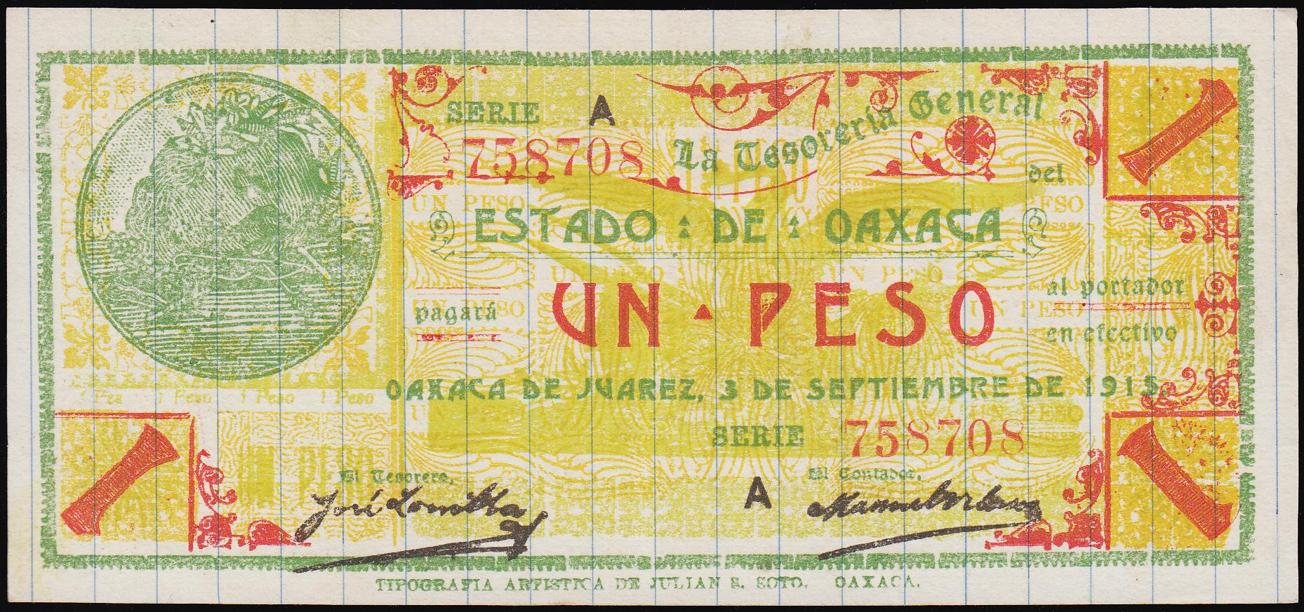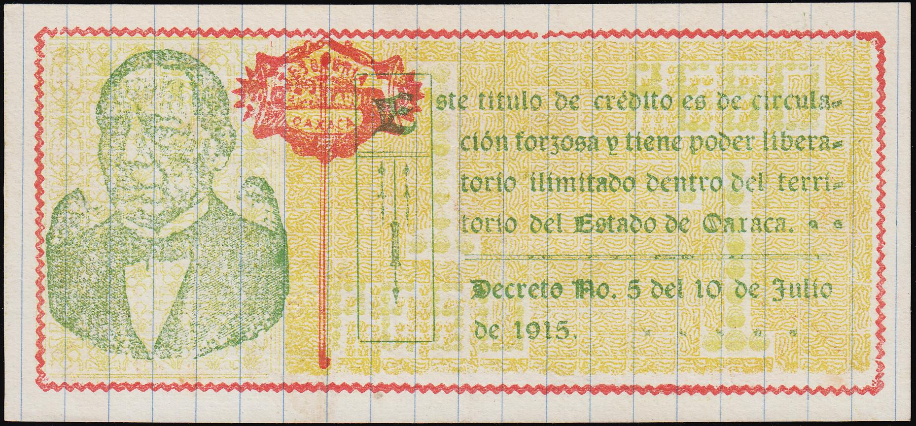 The bill, issued by the State Bank of Chihuahua has text that indicates that the bill is legal tender in accordance with a December 1913 decree. Under the vignette, the text says that the bill is "national gold value" - what I assume to be the equivalent of a US Gold Certificate, in that it would have been exchangeable for gold at the State Bank of Chihuahua.