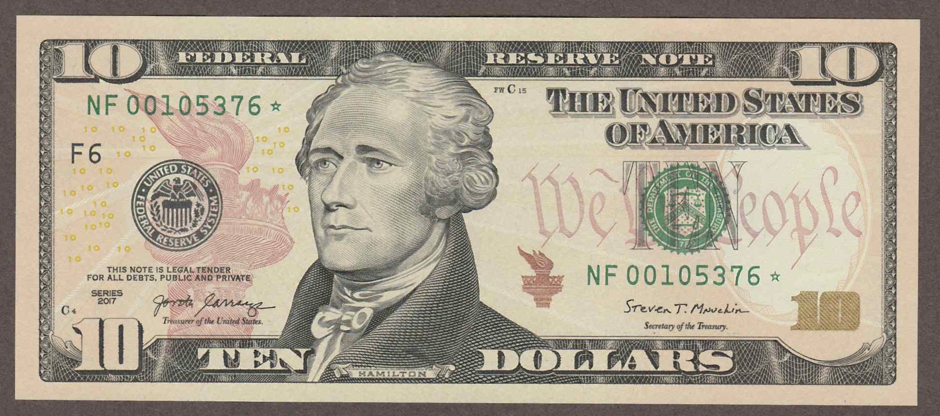 A tougher modern $10 replacement note. From a short run of 4,000 sheets (128K notes) printed in April 2019.