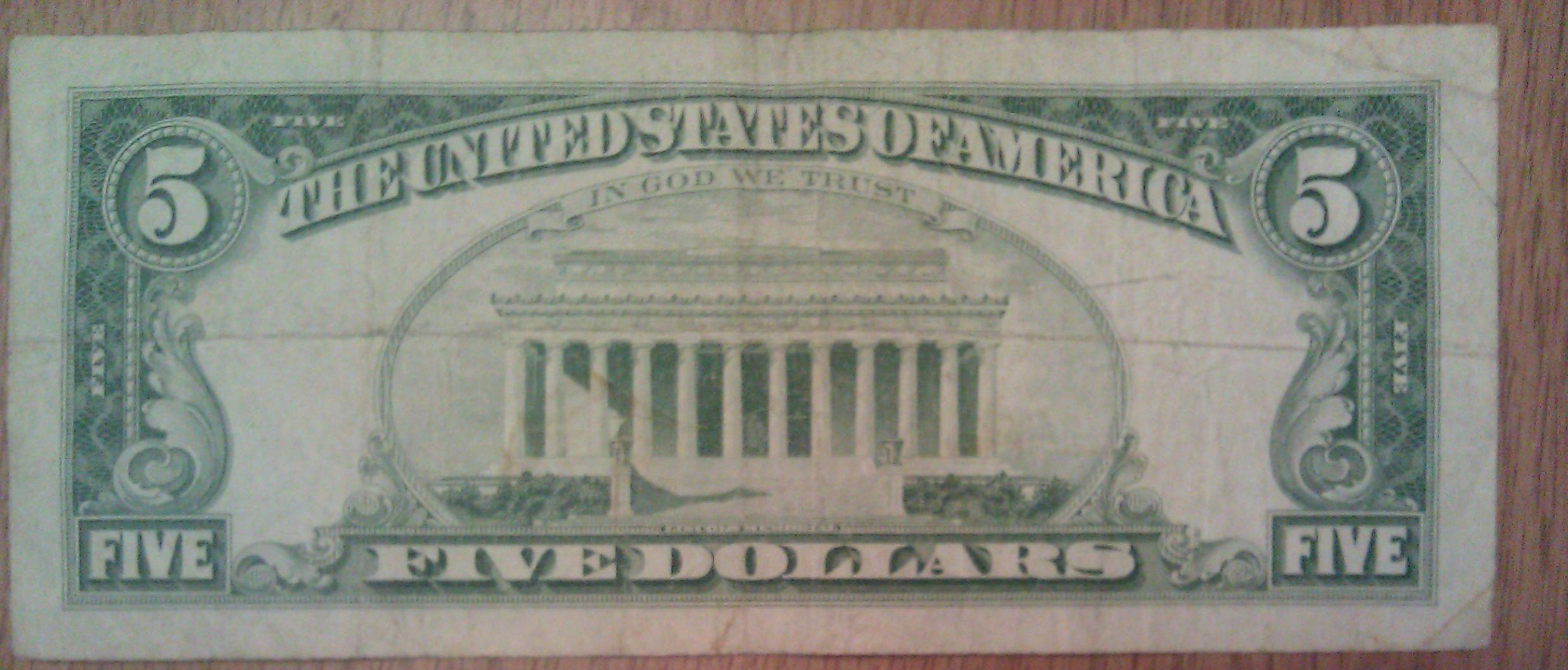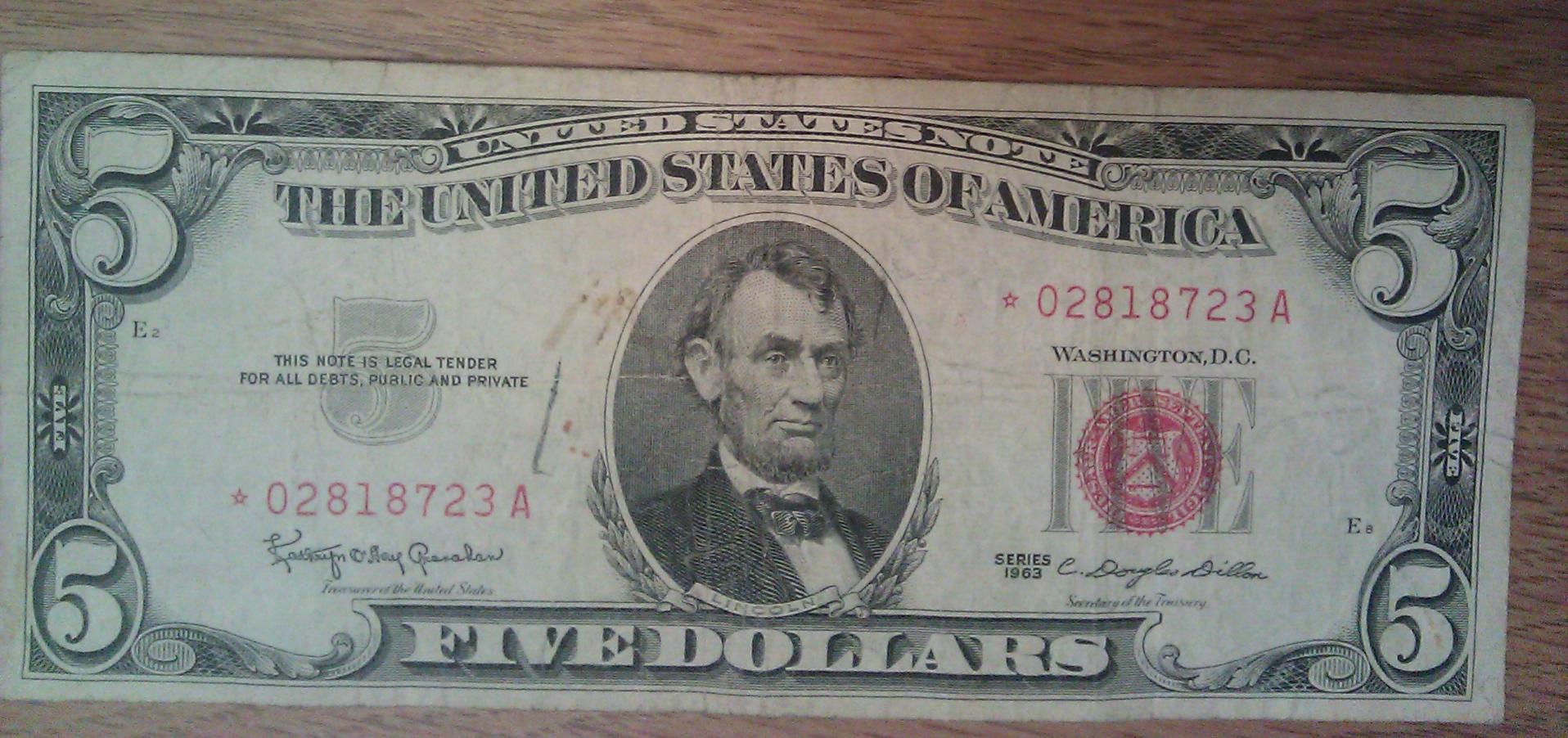 Picked up this 1963 $5 Legal Tender Star for $1.50 over face. It has some writing on it, and will probably grade a 15/Net. But not bad for the price. Not bad at all.
