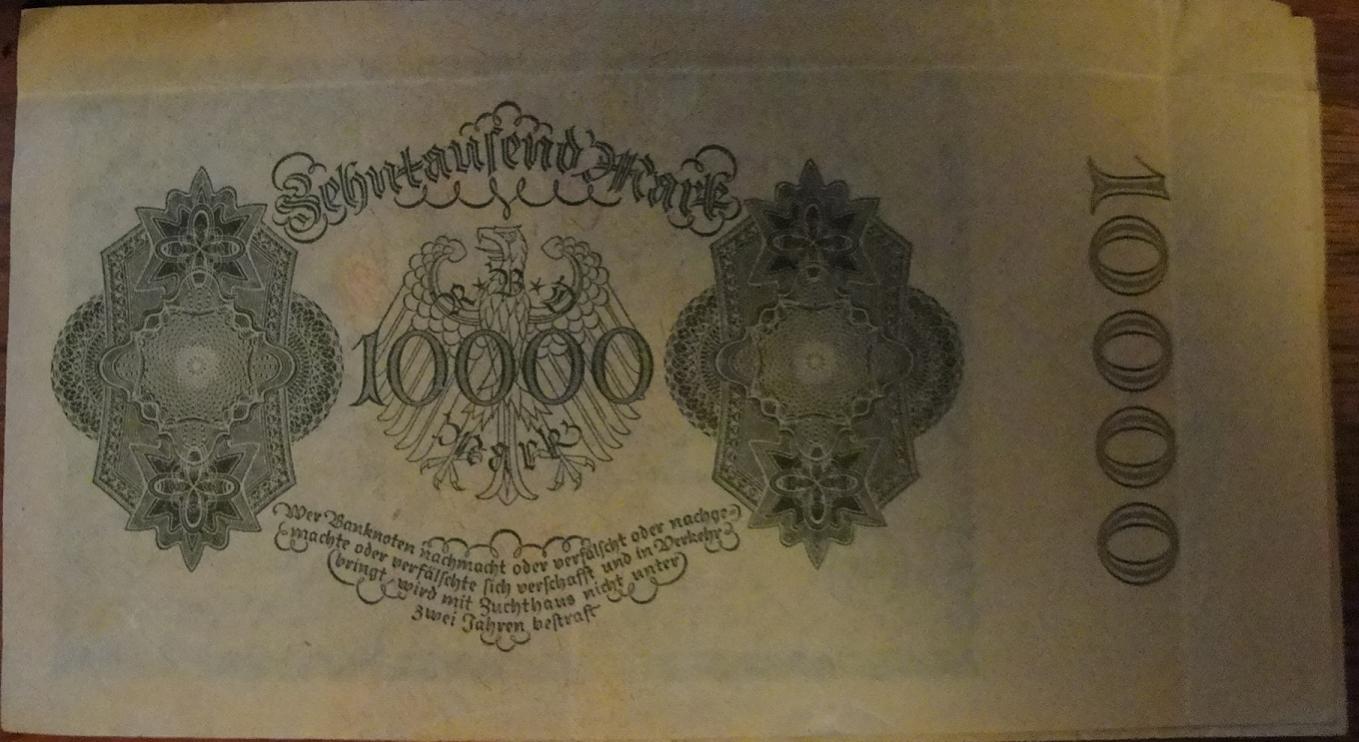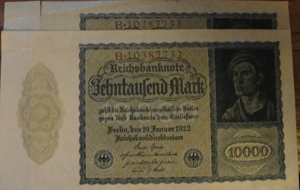Here are two 1922 10,000 Mark notes with consecutive serials. Pretty nice shape.