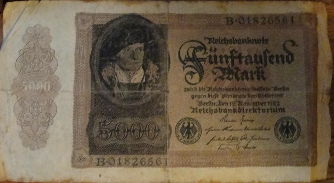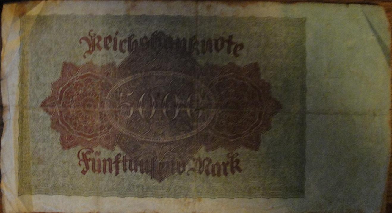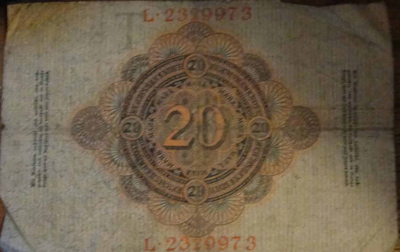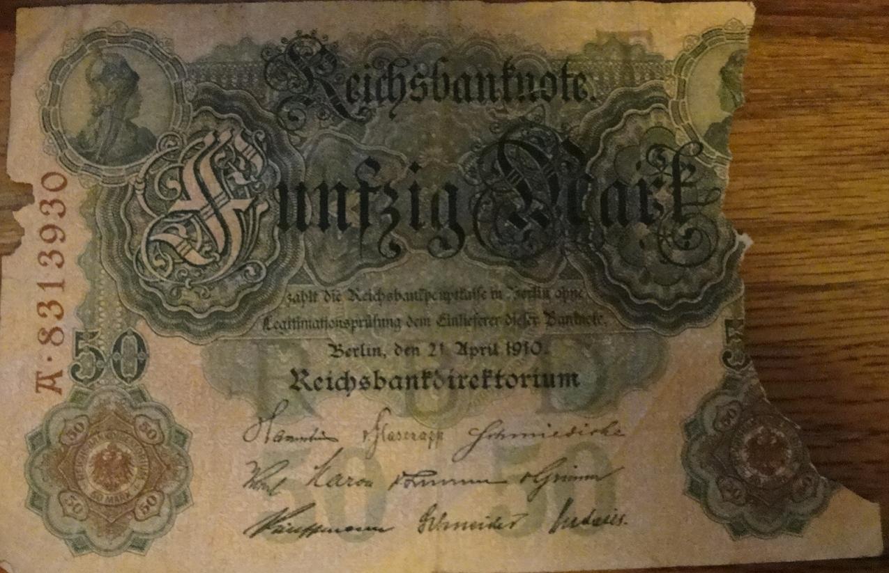 These first two have a similar characteristic: on the front of both the torn 1910 50 Mark and the 1914 20 Mark there is a "T" located just after the top heading "Reichsbanknote" and this same letter "T" is located just before the top serial number on the back. What is that? It's not on any of the others.