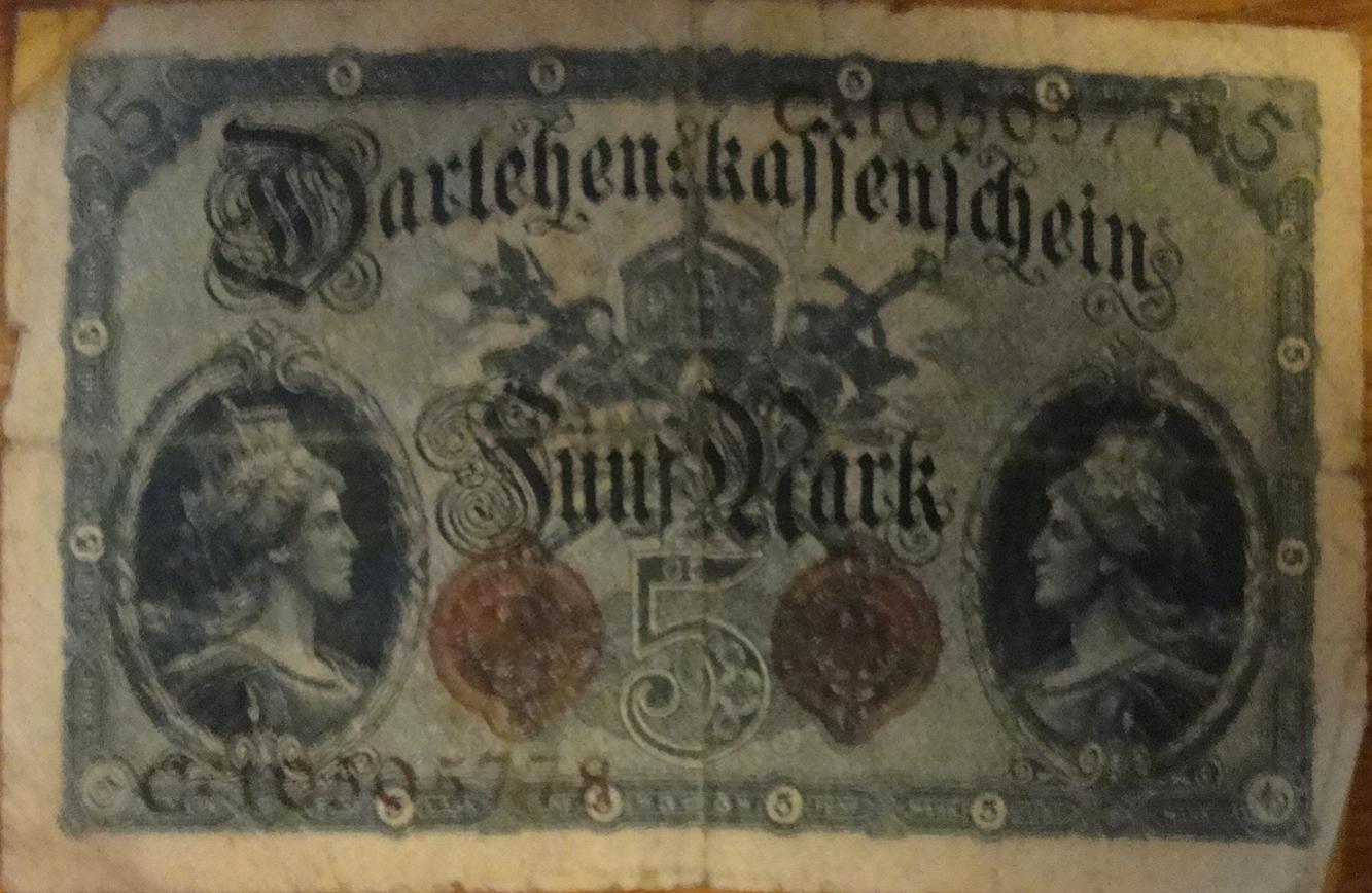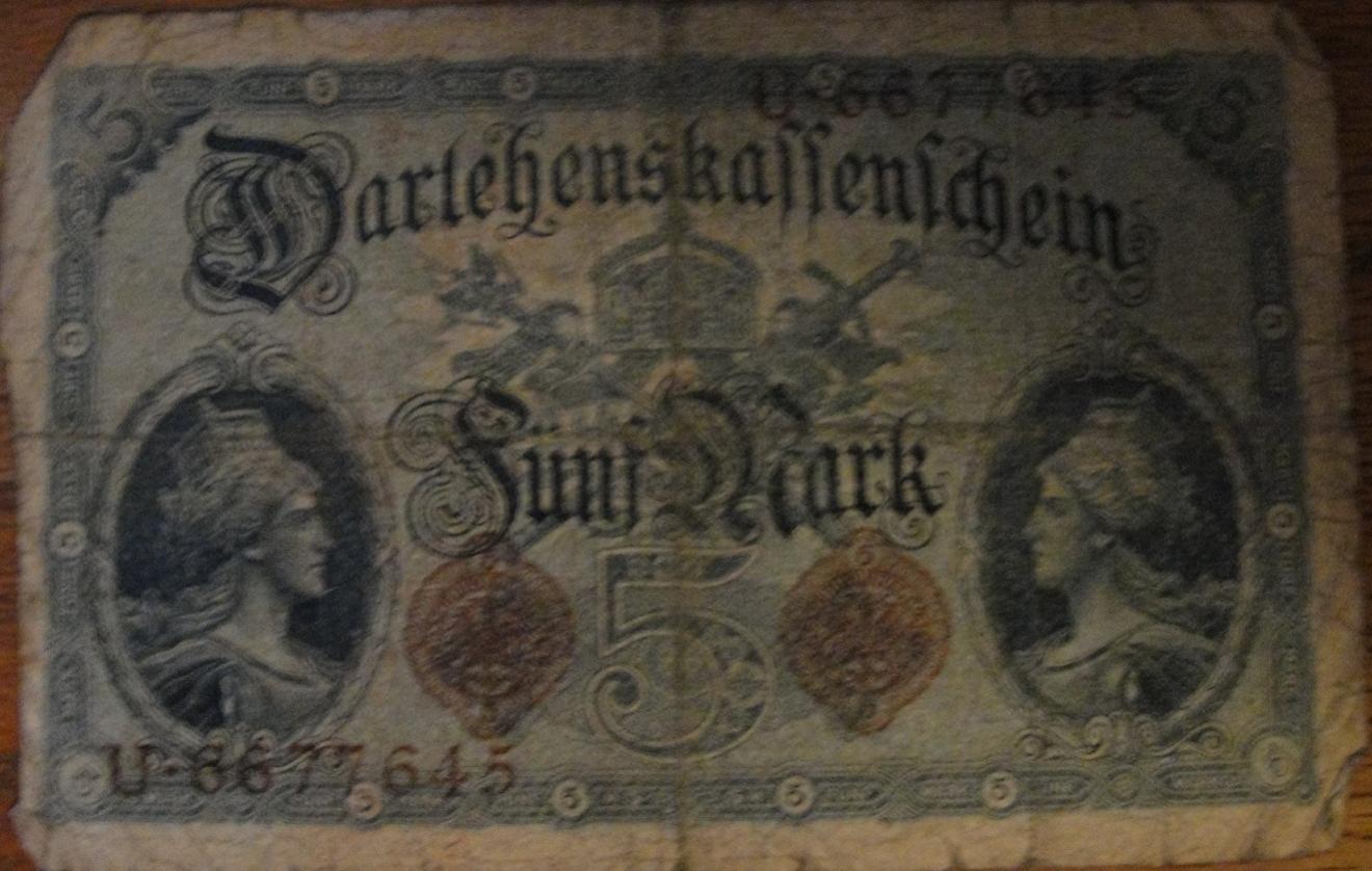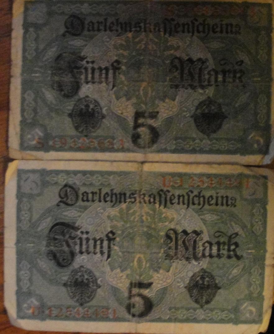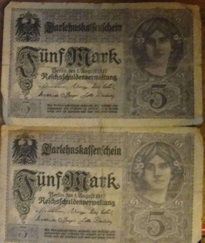 Two 1917 5 Mark notes, and an awesome 20 Mark note issued Feb. 20, 1918. Not long before Germany's surrender. Love the military vignettes on this note! :)
