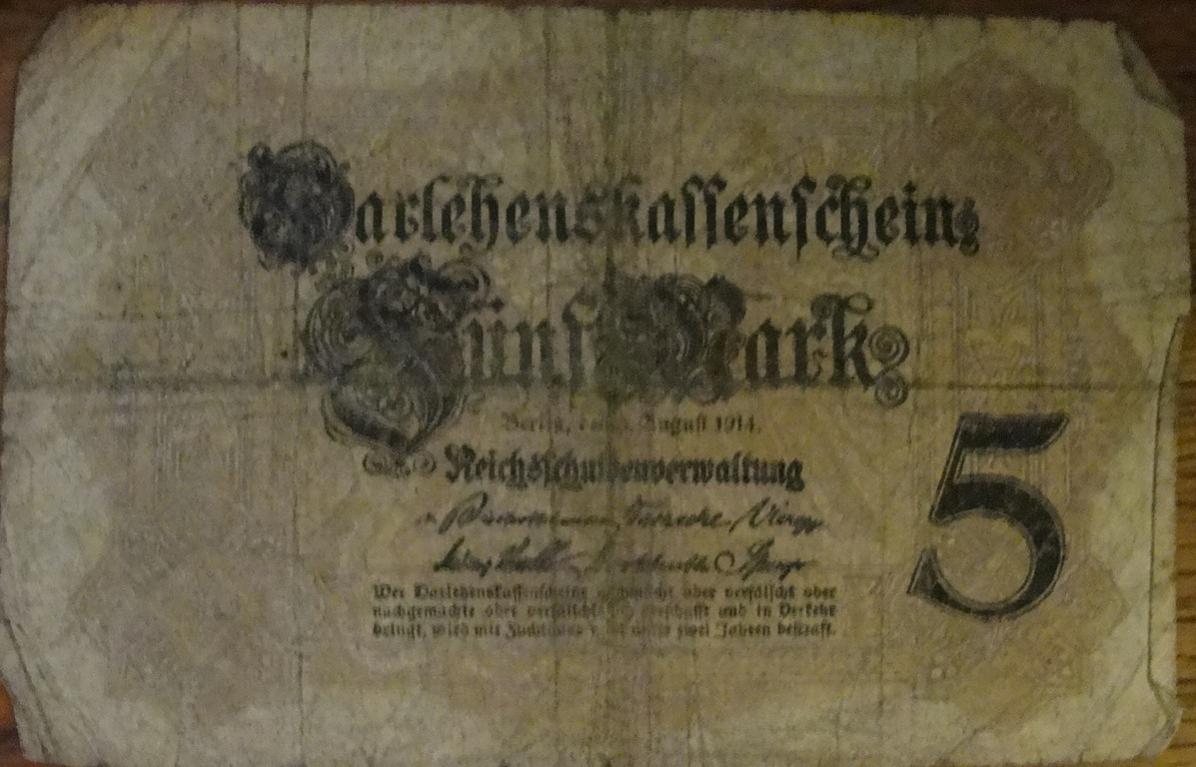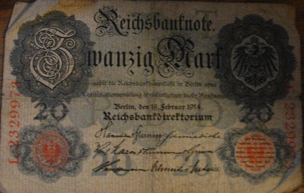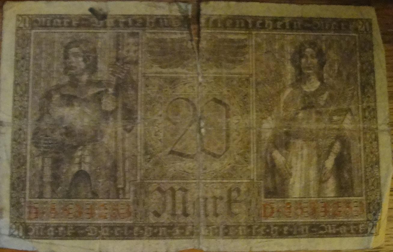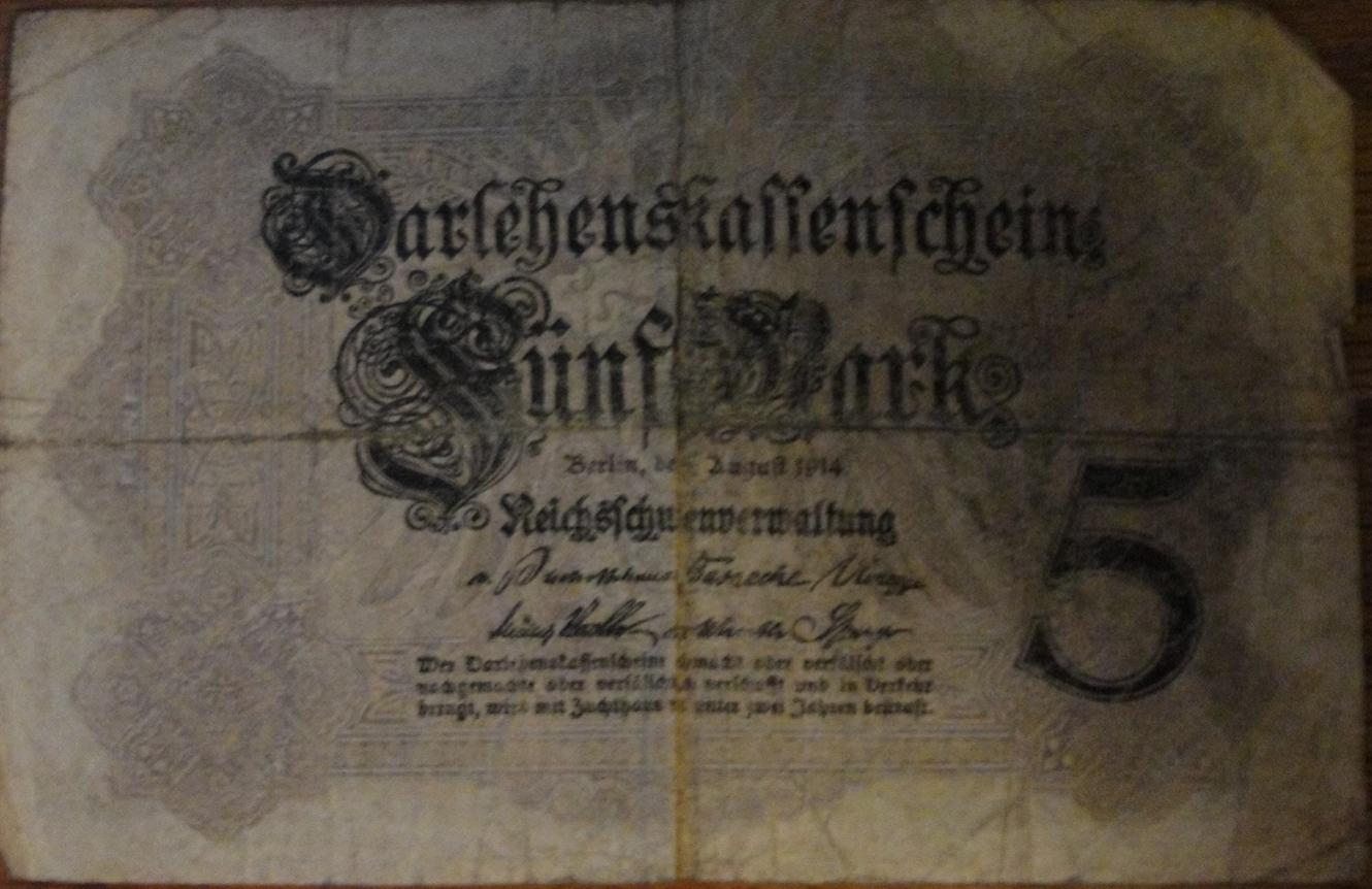 Two 1917 5 Mark notes, and an awesome 20 Mark note issued Feb. 20, 1918. Not long before Germany's surrender. Love the military vignettes on this note! :)