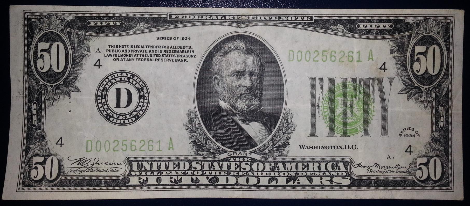 Mid grade 1934 $50 Light Green Seal. It has a few pinholes, but a good deal for just a few bucks over face.