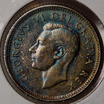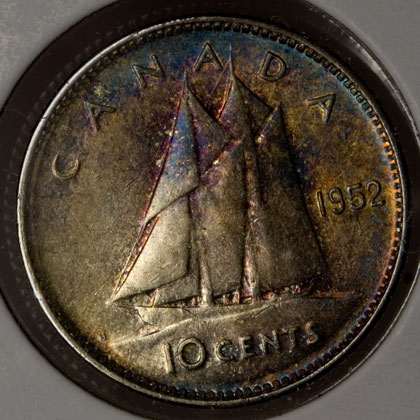 Okay, this was a small lot, so it bore only small surprises. A couple of the quarters and dimes look like very nice uncirculated specimens. As far as I can see, though, they have none of the "cartwheel" luster common to American business strikes -- they appear to have mirrored surfaces like American proofs. Is this normal for Canadian coinage (early 1960s)? There were also a few older, well-circulated quarters -- one from the 1930's, and one or two from the 1940's. For the toning fans, here are two of the older dimes: Alas, I've lost the color profile I used to use for converting RAW images from my camera before exporting them as JPEGs, so these look a lot duller than they did in the original photos, which in turn look duller than the actual coins. That blue is really electric and lustrous. I'm still not sure I'm a toner fan, but these, particularly that 1952 specimen, really grabbed me.