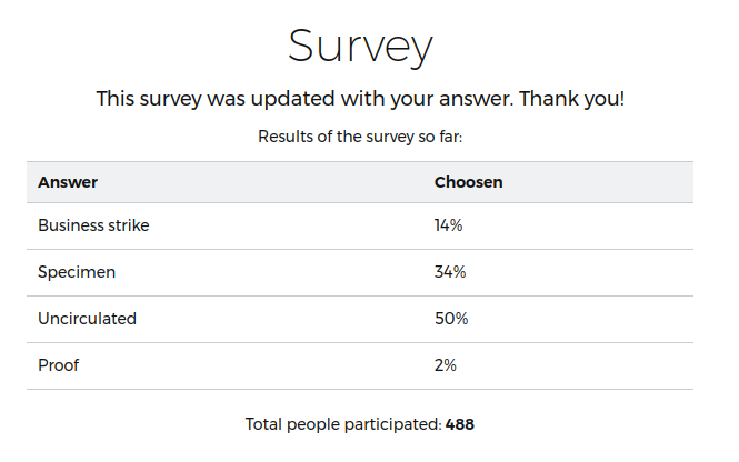 I get a mailer from PCGS in which they always have a question/poll for a prize. Now, naively thinking people reading on PCGS would be seasoned coin collectors, I was interested to see how the experts on CT would respond. My answer is "uncirculated" since we have gone round and round on here as to what constitutes an "uncirculated" coin, and AFAIK the answer was "If it shows no signs of wear, it is uncirculated" because we don't know the coin's history! Proof - proof coins are specifically made, business strike coins are made as business strikes, specimen...of this one I had doubts, but since there could be only one winner, I chose "uncirculated". Here are the results from the PCGS mailer...