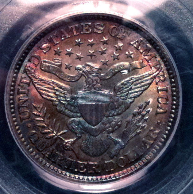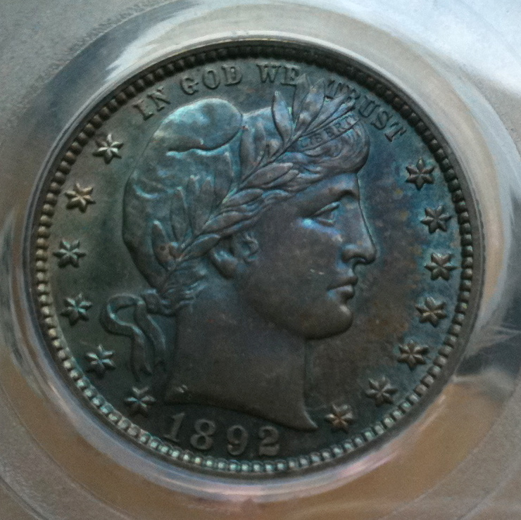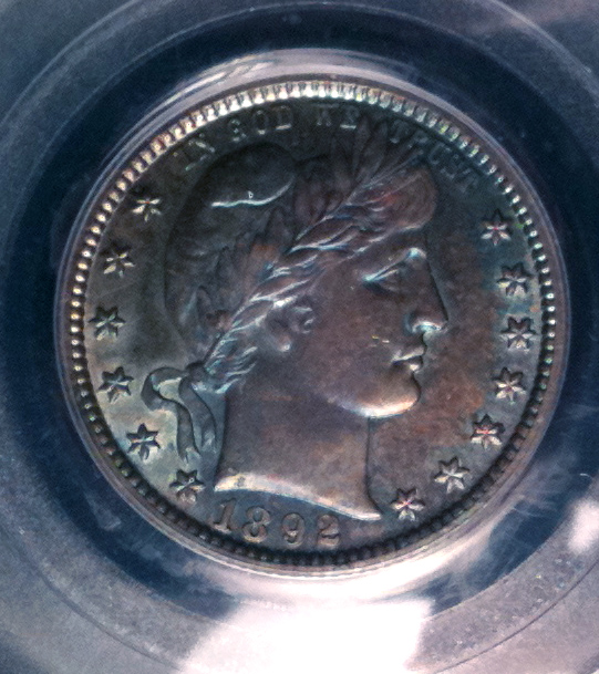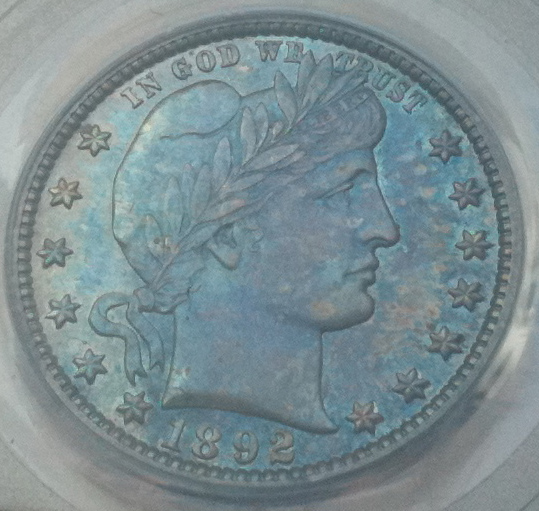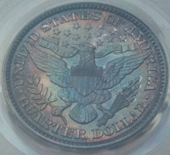 Did you ever buy something on a whim and then immediately regret it? I recently bought a PCGS Genuine Barber Quarter with what appears to be MS details because it was cheap. It looks like a mint state underneath the color, but I wonder if the articial color might be hiding hairlines from an improper cleaning (or would PCGS have detected that and assigned improperly cleaned) Still, someone thought enough of this coin to submit to PCGS for grading. Should I crack it out of the slab and then give it a quick dip to remove the color? I wonder if I did that, if I would get a coin that would grade? Or should I just stick it out on ebay in the PCGS Genuine holder and get what I can for it? This is what the beast looks like in direct sunlight ... I would like to dump it and I am looking for suggestions. Moral: Dont ever buy anything on whim because it's cheap!
