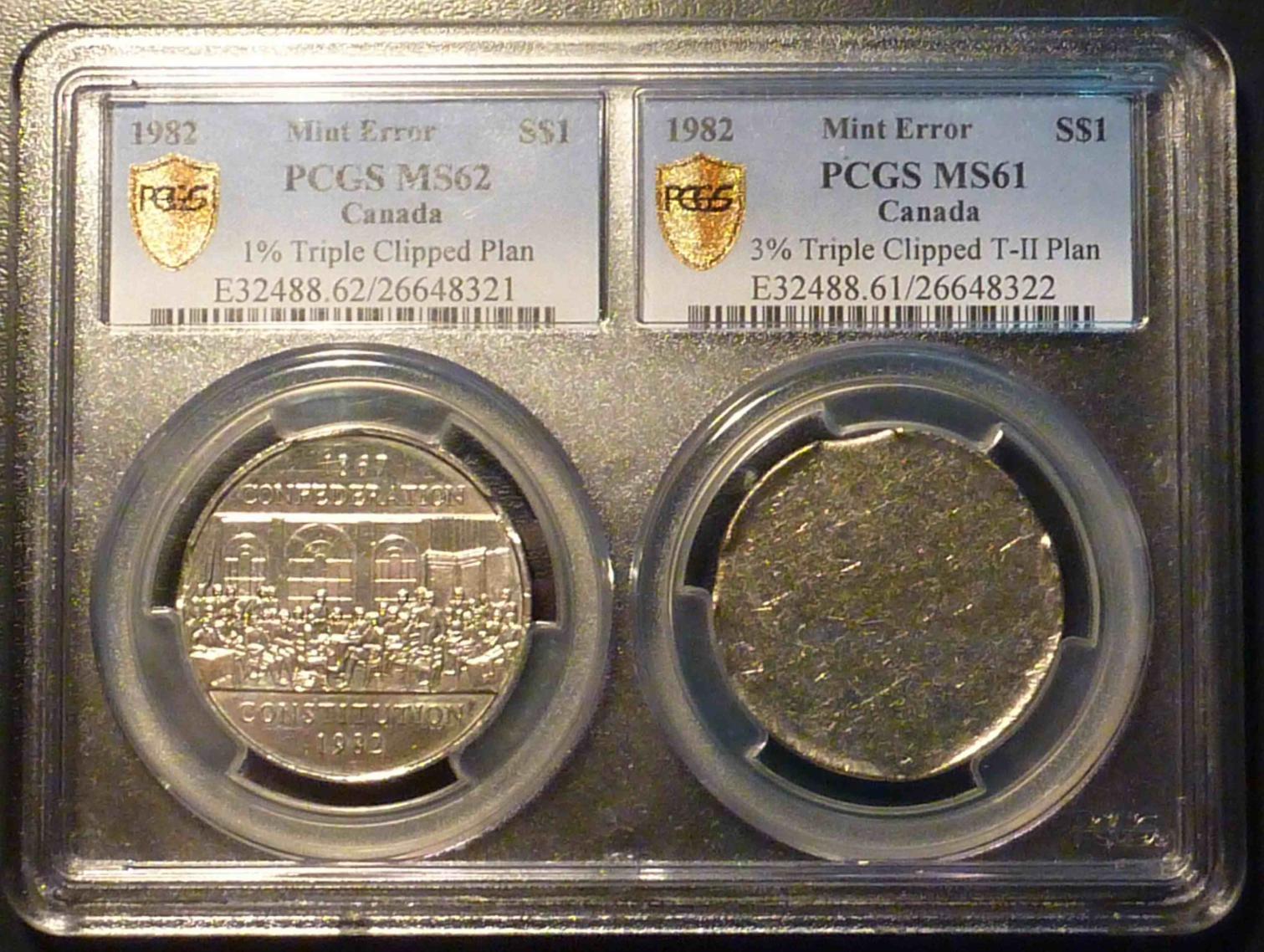 I just got a multi-coin holder back from PCGS - and I love it!! I had this error coin, a Canadian 1982 Constitution nickel dollar, triple clipped. I found it's brother, a collector found it in a mint-wrapped roll, and sold it me this past November. It is a blank, rimmed (type 2) planchet, with matching triple clips. So I thought it would be a perfect pair for the PCGS multi-coin holder. They even took the care to "match" up the clips on both coins.