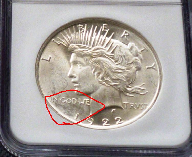 The primary difference I see in the two coins is the area I circled in red. If it were not for all those scuff marks in that area I have no doubt the coins would have graded the same. Those marks hurt the eye appeal of the coin, and eye appeal is second only to luster when it comes to grading. But you also have to remember that the difference between a low end 64 and a high end 63, which is what these 2 coins are, is indeed very slight.