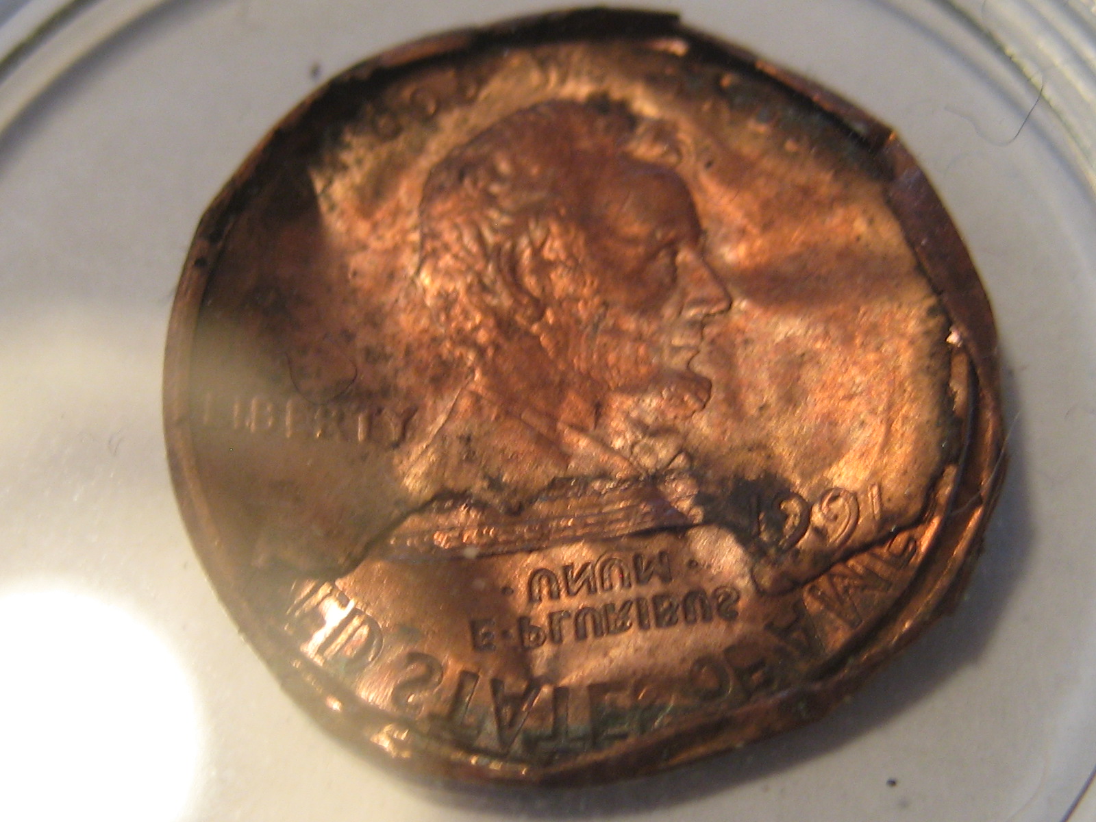 You can see on the heads side where some of it is missing and also the pic of the edge where it's still intact and connected to the tails side.