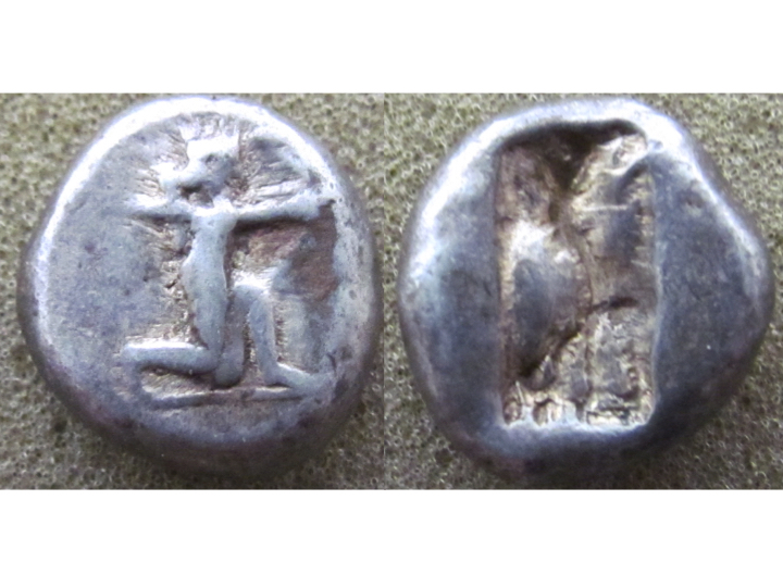 KINGS OF PERSIA, Xerxes I - Darius II Denomination: AR Siglos (Type IIIb (early)), minted: Sardis; ca. 485-420 bc Obv: Kneeling-running figure of the Great King right, transverse spear with point downward in right, bow in left, bearded, crowned. Drapery with naturalistic fold over the advanced left knee. Central banker mark. Rev: Incuse, with four bankers marks: at 9'o clock nr 71/72, at 6'o clock nr 46, at 3'o clock nr. 47; central nr. 1, as published by George F. Hill in the British Museum Catalog, volume on Persia, p. cxxxvii (found here: https://www.forumancientcoins.com/numiswiki/view.asp?key=Siglos) Weight: 5.5g; Ø:1.2mm Catalogue: Carradice Type IIIb C (pl. XIV, 36). BMC Arabia pl. XXV, 15. Provenance: Ex. private collection; acq.: 04-2019