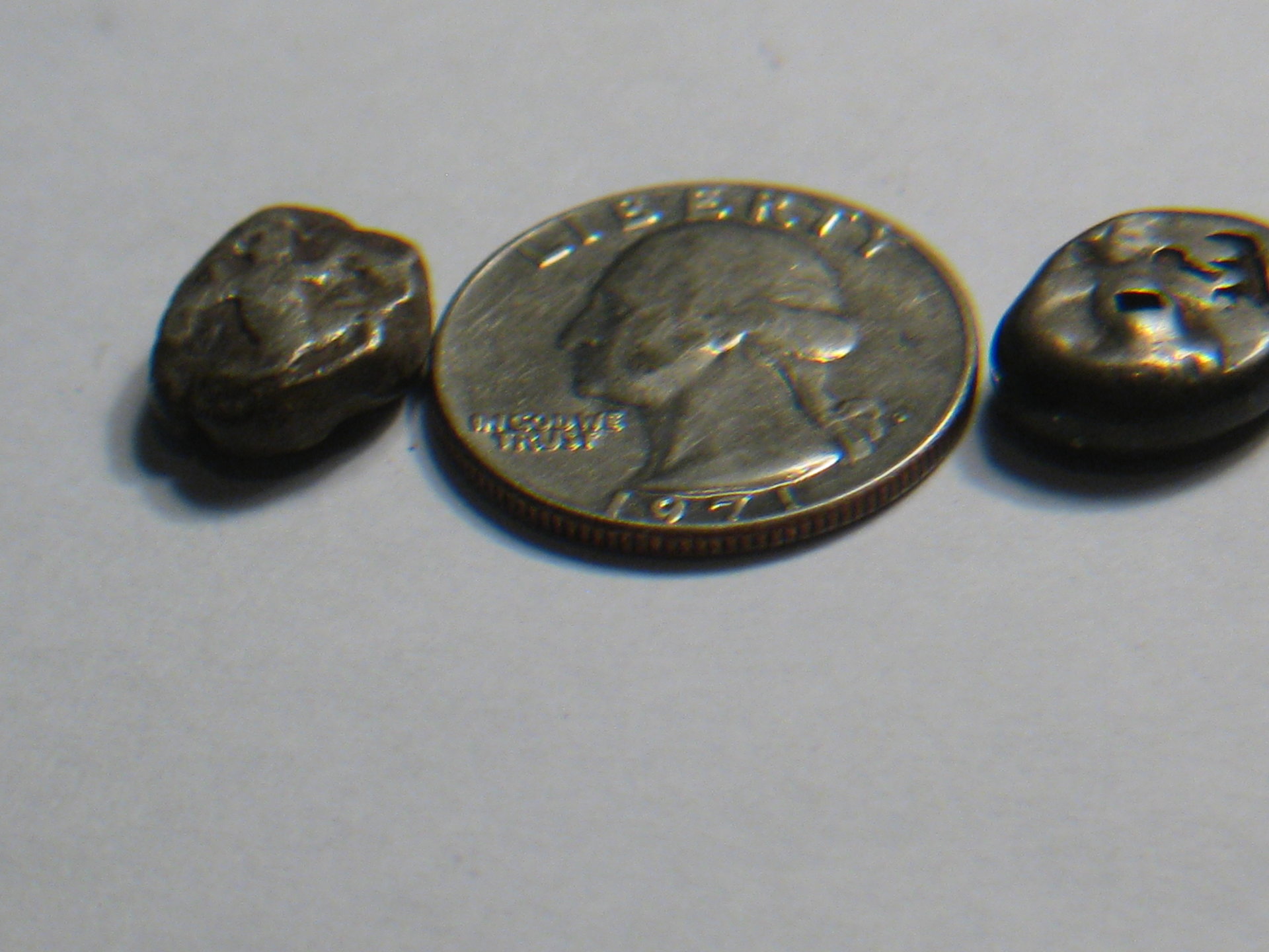 After checking my scales against a standard 700 grain weight it was off by .1 grain. Close enough. I just ran the weights on a dozen sigloi: a Type II, a type IV, and the rest type III. Switching to grams: The heaviest was 5.59g, the lightest was 5.32g; the median was 5.50g. Based on this limited sample, I think the target weight for a siglos is close to my median, 5.50g. => 1/3 ~ 1.83g; 1/4 ~ 1.38g; 1/6 ~ .92g; 1/12 ~ .46g At that rate, Doug, your weights and denoms seem to be on scale. My three in this post are light but in range as we have pegged them. What I bought as a 6th is really a quarter.