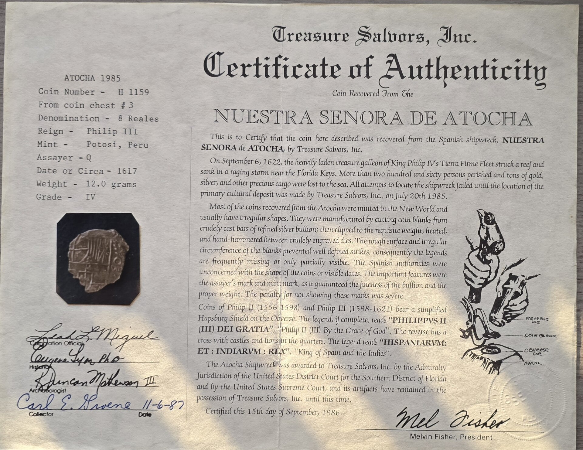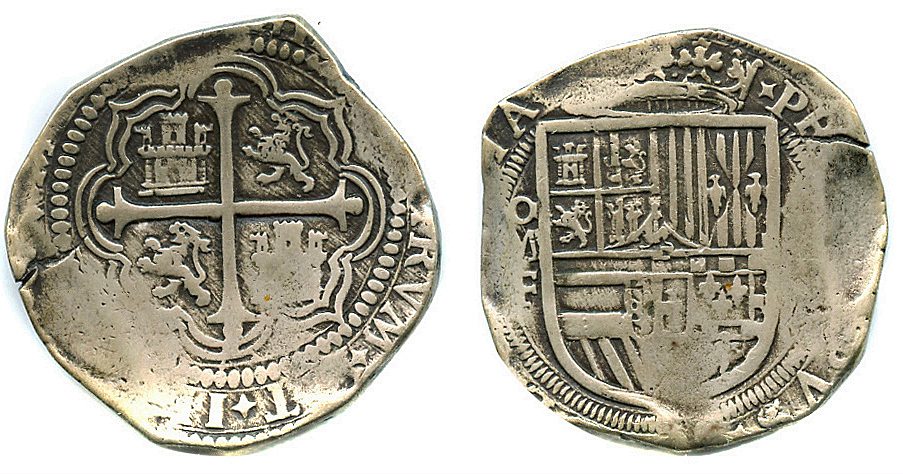 Judging from the photos that coin looks like a typical salvaged coin from Mel Fisher, mostly likely Atocha. The coin incurred major weight loss due to corrosion, and it has be over-cleaned, a common feature of his coins.