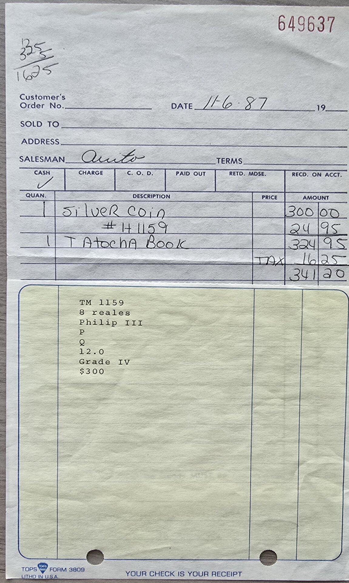 I was really attracted to this coin's excellent strike, despite the fact that it one of the more "common" Philip III cobs from Mexico, and the bidding was quite stiff, even back then, with an $850 closing price. The brothers in Mexico City who made the copies in the early 1960s did a pretty good job casting them, but they do have tell tale signs of casting, such as the filled flan cracks and lower weight, many times significantly lower, and pretty low silver content.