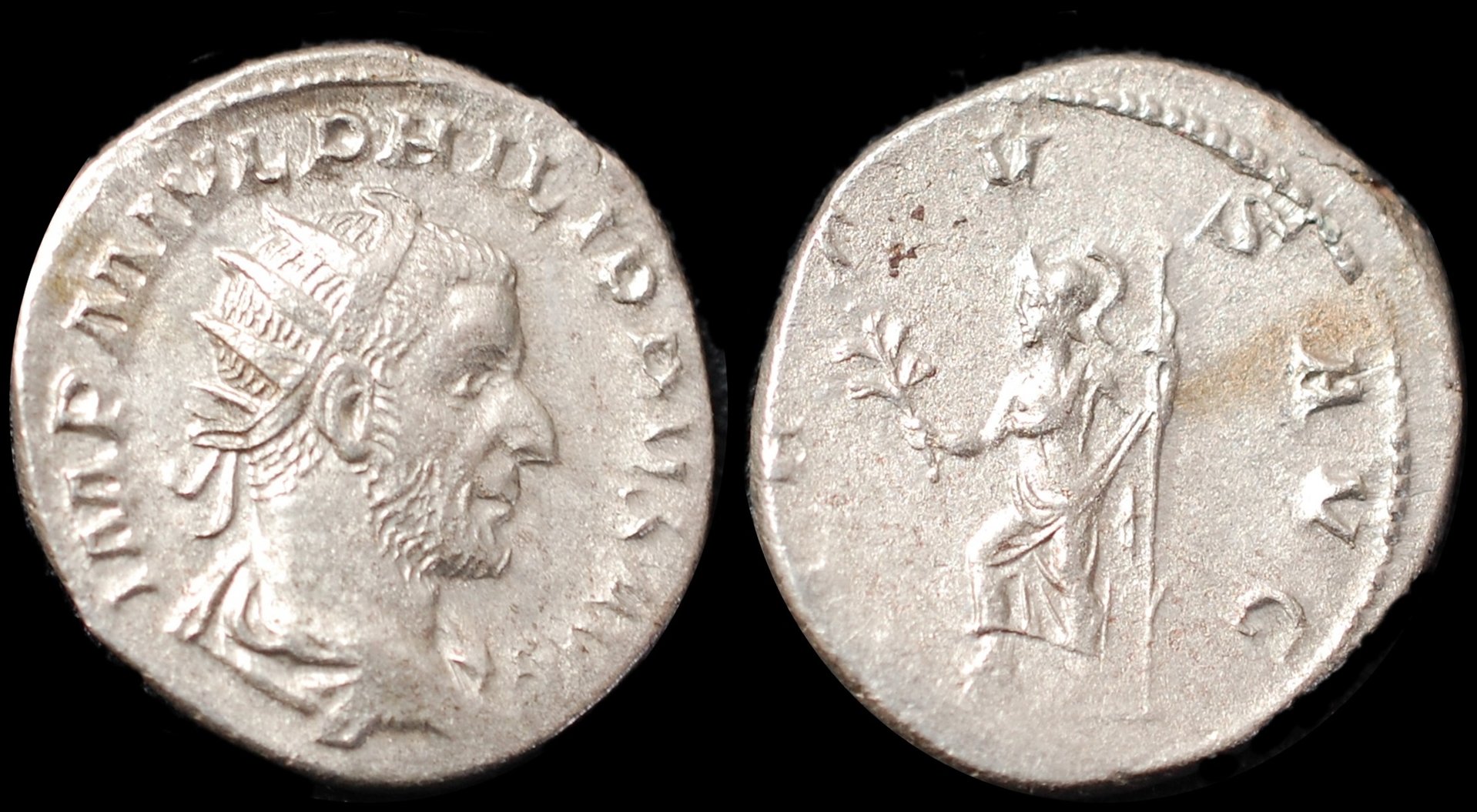 This year I am not focusing on collecting, but intent on photographing my coins as best I can. I have a very small dark side collection, and no real goals for a specific set. Rather I am eclectic in this and will eventually maybe find my way to a particular grouping. Although I have photo'd some of my coins already and shared them, my goal is to systematically go through and re-photograph as best I can, and then update and create an album. In the end, I may re-do some if I feel I can represent them better as to what they actually look like as far as color, depth, etc. Any I post with info you thing is not quite right, let me know. I really do want to also know my coins and find out what I should be learning about them to really appreciate these. My first one for 2019 photographing on Ancients in this endeavor: Philip I (Feb 244- Aug or Sep 249 AD) Ref Philip I AR Antoninianus, RIC 52, RSC 239, SEAR 8974 Philip I AR Antoninianus (Philip the Arab). Obv: IMP M IVL PHILIPPVS AVG, radiate draped bust right Rev: VIRTVS AVG, Virtus (or Minerva) standing left, foot on helmet holding olive branch & spear. RIC 52; Cohen 239; Sear 8974. Philip succeeded Gordian III, and was in his short time sympathetic to the Christian faith. He was born in the Roman provice of Arabia, in what is now Shahba, Syria, which is about 56 miles outside of Damascus, and was the son of Julius Marinus, a citizen there. He had a brother, Gaius Julius Priscus who was a member of the Praetorian Guard under Gordian II, and Philip's wife was Marcia Otacilia Severa. He was killed in Beroea, in Macedonia at the battle of Verona, possibly in what is now Bulgaria but which territory was part of the Macedon rule but was not the Kindom but was part of the dependent Territory. Some places are putting Berea/Verea/Virea, etc., (Beroea) as being at Aleppo, Syria, and others as in Northern Greece (which was evidenty in the Kindom of Macedon then) or in Verona, in Italy, and it is confusing when looking at info on-line. I am thinking it actually was in Macedonia, just to the west of the Black Sea rather than away from that area and in Syria, Italy or Greece. At this time simply don't know which current place that battle actually took place. (Look for updates from me in this thread when I get the info) Philip married Marcia Otacila Severa. They had two sons and one daughter, a son named Marcus Julius Philippus Severus (Philippus II and co-ruler, as ordained by Philip I in 247), born in 238, a daughter called Julia Severa or Severina who is known from numismatic evidence but is never mentioned by the ancient Roman sources and a son named Quintus Philippus Severus, born in 247. Philippus II, was killed also in 249 by the Praetorian guard, shortly after his father was killed, and the boy was 11 or 12 years old. This so Philip I could be succeeded by Gaius Messius Quintus Decius (Decius), also known as Trajan Decius, who was the man who bested Philip I in the battle of Verona. No mention is found to say that the rest of the family died then, too or if his heirs lived longer than the year 249. What is said is that Philippus II died in his mother's arms. The goddess Minerva (Virtus --- 'courage') was a Roman deity who was goddess of the world; she was the embodiment of the imperial ideal of the city as ruler of the world, so on this coin, she personifies the city of Rome.