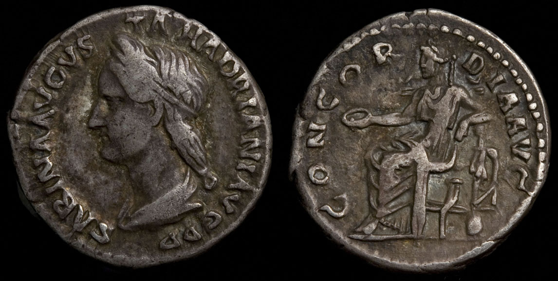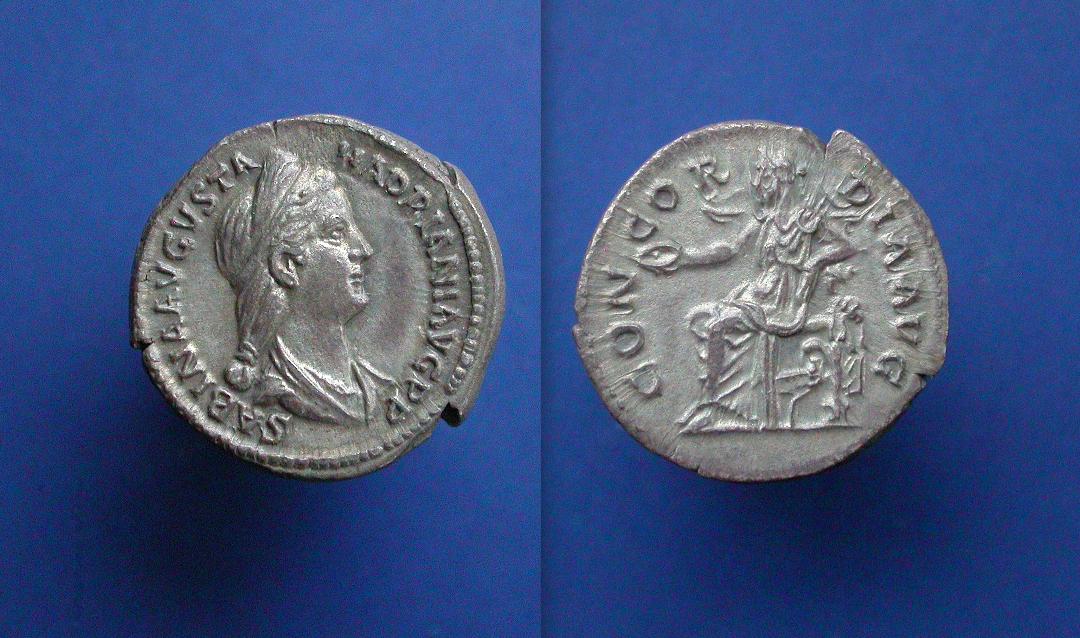 Sabina Ar Denarius 129 AD Obv Bust right diademed hair in long plait at back. Rv Concordia seated left. RIC 398b RIC II/3 2501 3.19 grms 18 mm Photo by W. Hansen Sabina is the first Roman Empress to be featured on the coinage with any regularity. Whereas many Roman women have been featured on the coinage, their appearance is usually of short duration or of a commemorative nature making their coins scarce. This is interesting as it is generally thought that Hadrian had very little interest in her and did not treat her well.