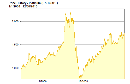 Platinum is heavily industrial and doesn't have the collector appeal to most bullion types (plus it's too expensive for many). That said I do see Pt going over $1800 in 2011 and possibly to $1900. I really feel $2,000 Platinum won't be here until 2012 at the earliest.