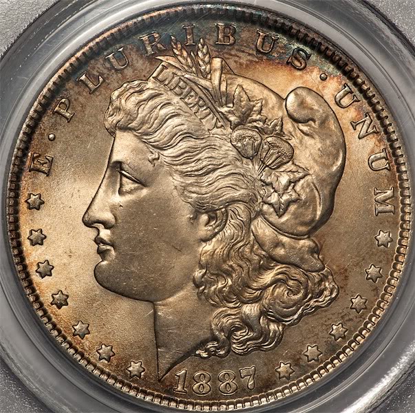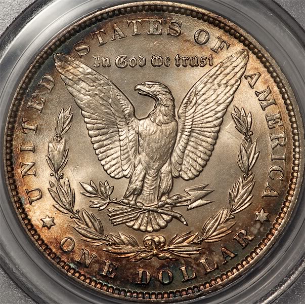 Thanks for the nice words! Sometimes there's a bit of luck to it all. I have a dozen different bulbs but mostly I use two halogen floods and sometimes a third halogen spot which I move around a lot. Of the three macro lenses (50, 105, 180mm) I use the longest most often. That way I can bring the lens 12-18" away from the coin and get the lights very high and direct. Most problems with photos are related to focus, exposure, and saturation. Poor focus is fatal. Nothing will save it. Overexposure and glare, as well as underexposure, can often be corrected with post-processing s/w especially if you shoot in the "raw" mode. You can recover data in shadows and bring back data due to excessive glare. Saturation, like excessive contrast, can yield images with stunning color but they're not realistic. Who are we kidding? Here are images of an ordinary Morgan with unusual colors and pretty surfaces. They are very close to what the coin really looks like in hand. PCGS was a little tough on the grade (64). Lance.