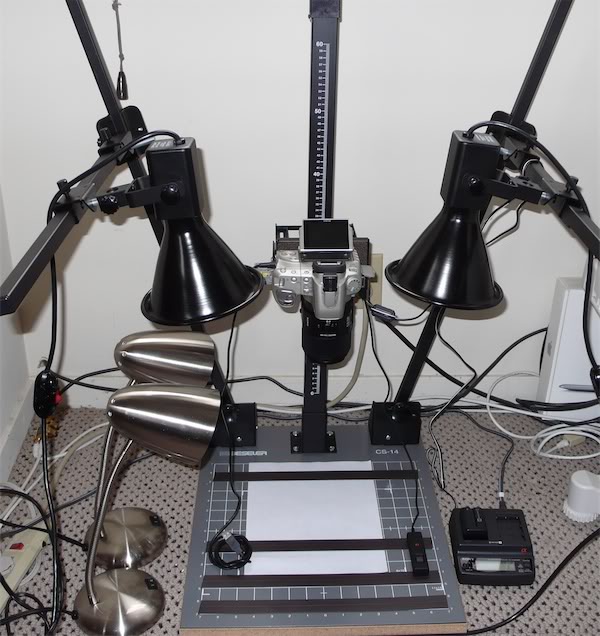 Well, I usually say that the actual gear is not that important. D-SLR's are so good today I don't think you can choose badly. I am one of few using a Sony (a300). I like it because I don't have to use the viewfinder to see the image. There's an LCD screen. But I do love the idea of seeing everything on a computer and making adjustments from a big picture before shooting it. If I ever start over that will be a requirement. Here's a pic of my set up. It's not on the floor anymore and I use a longer macro lens but otherwise it is correct. A steady, strong copy stand, remote shutter release, more than enough lighting, and an A/C connection instead of charging and swapping batteries. Finally, and most importantly, is software. I know Photoshop pretty well and it is everything anyone might need. But a few years ago I moved to a Mac which, as everyone knows, is the preferred platform for anything arty or creative. Apple has a wonderful application, Aperture, which does everything I need. Except circle-crop! How could they forget that feature? So there's an extra step to get something like this. Cheers, Lance.