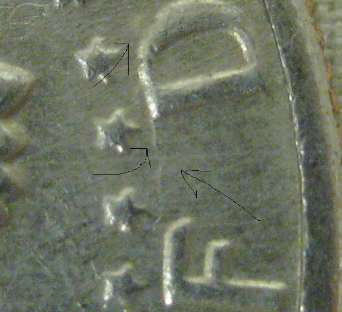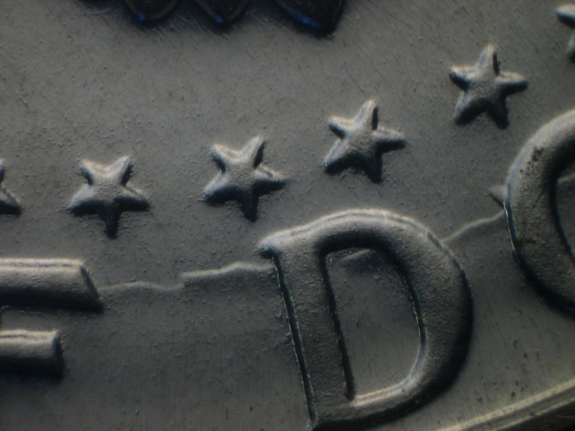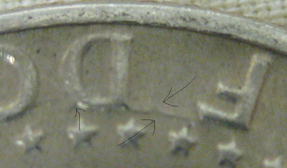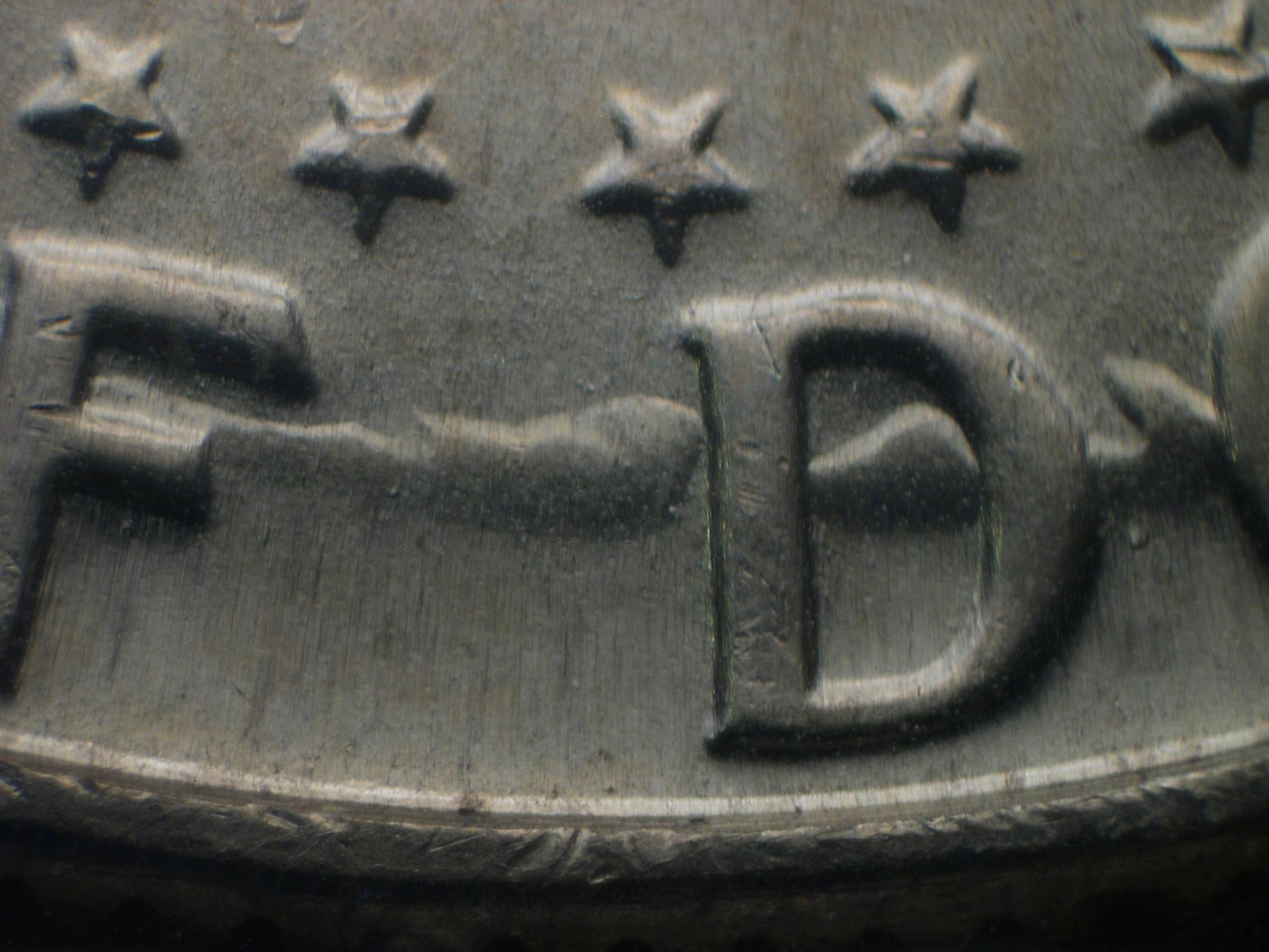 This looks like a "wrinkle" in the coin It is raised up. It is not a scratch, gouge, dent, etc. It is probably too light to be a crack, I think, sooo.... ??? It's hard to photograph, but is very clear to the naked eye in-hand. It runs from the top of the "f" to the top of the "d", along the top of the "d", and then connects to the edge of the "o". It is raised almost as high as the letters from the coin surface, and has the same luster as the rest of the surface. The lights here are unflattering to photos, sorry.