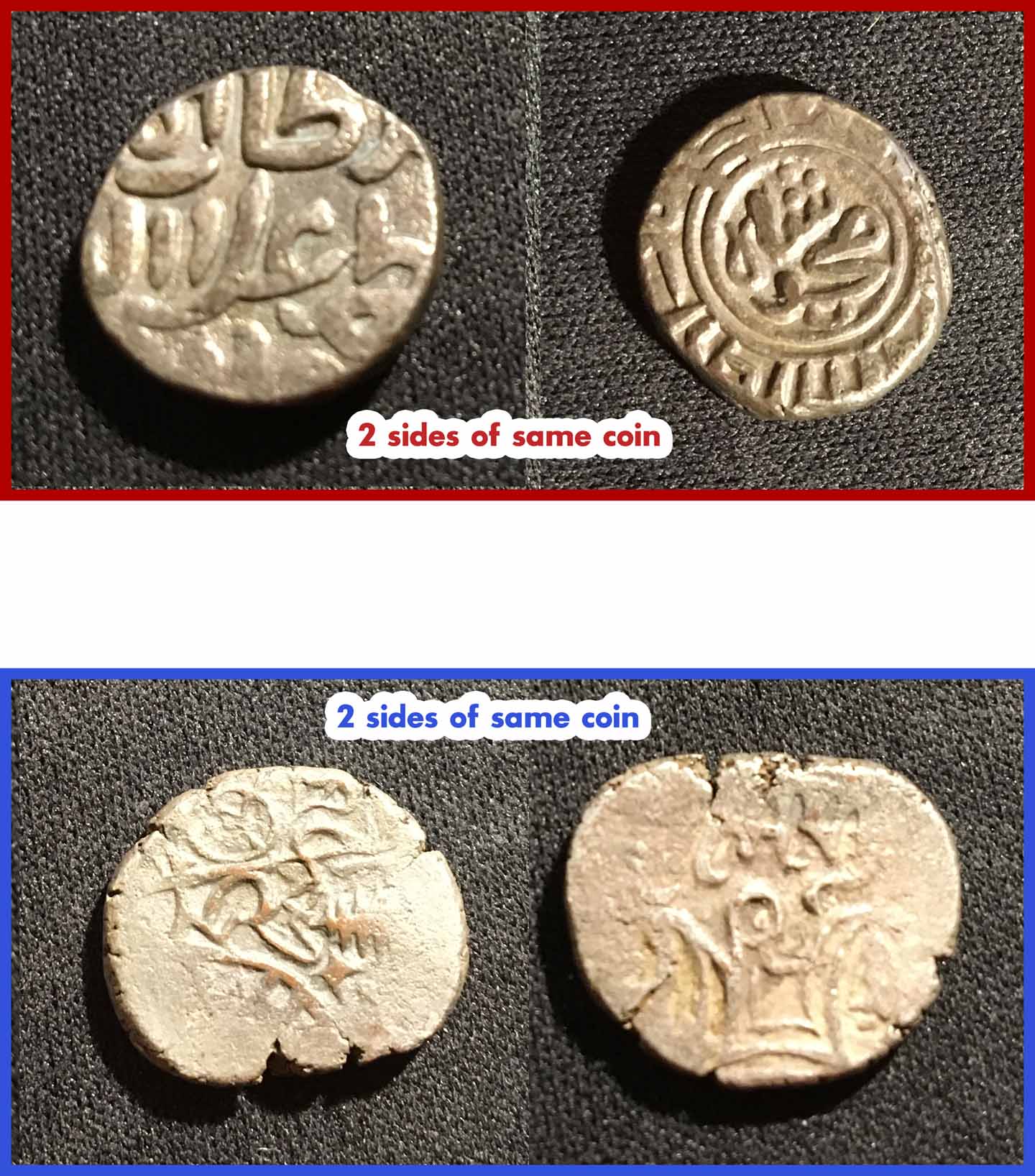 I bought these two coins from a coin magazine (maybe Coin World) about 40 years ago. They were inexpensive, but I think the ad said that they made of silver. I thought they looked cool, so I bought them. Does anyone know their origin, age, composition, value (if any), etc.? The coin with the concentric circle design weighs 3.56 grams, and the other oblong-shaped coin weighs 3.44 grams. My Lebanese friend looked at the coins and can read the words "Shah" and "Mohammed" on at least one of the coins, and says the alphabet looks Persian to him. Please let me know your thoughts. Thank you.
