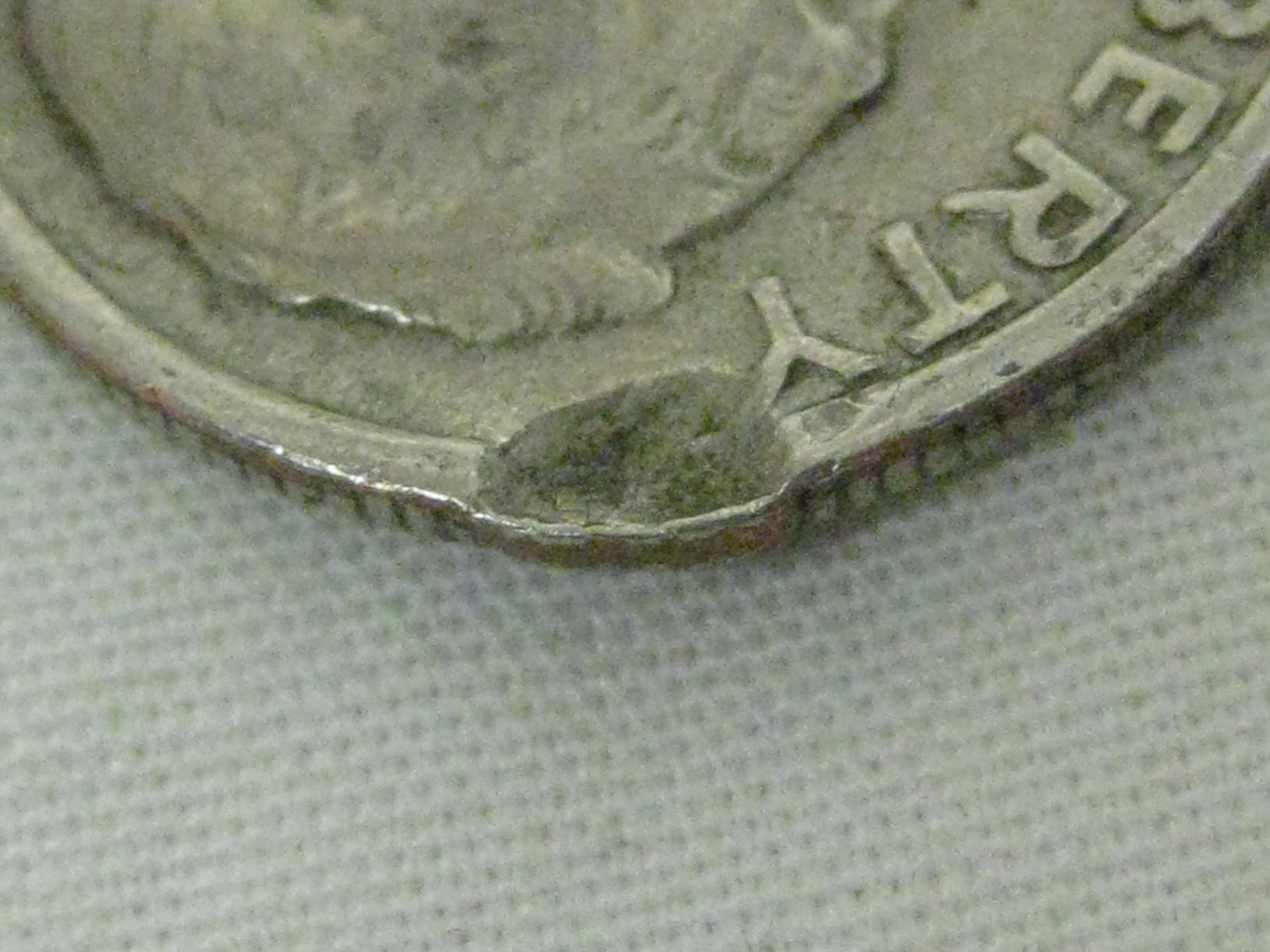 Actually, while I have you here, and we're on the subject, here is another oddity I have come across - please tell me how someone managed to remove this letter? To me, at least, it seems apparent it was removed from the coin purposefully, and there is nothing else wrong with it: