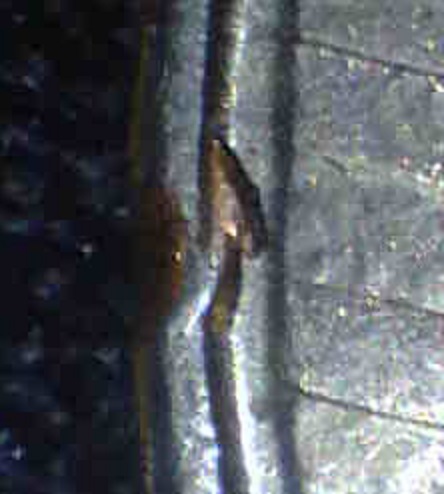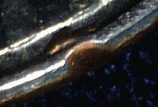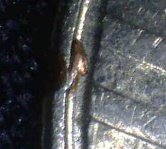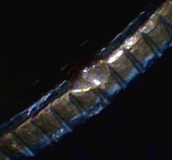 PDM The damage you can tell, I think, by the way the gouge on the edge, flows into the area of the design, instead out of it. The edge gouge cuts the reeds, if it was from then the reeds would have cut into it. If done before, then the die reeds would have cut into the gouge.