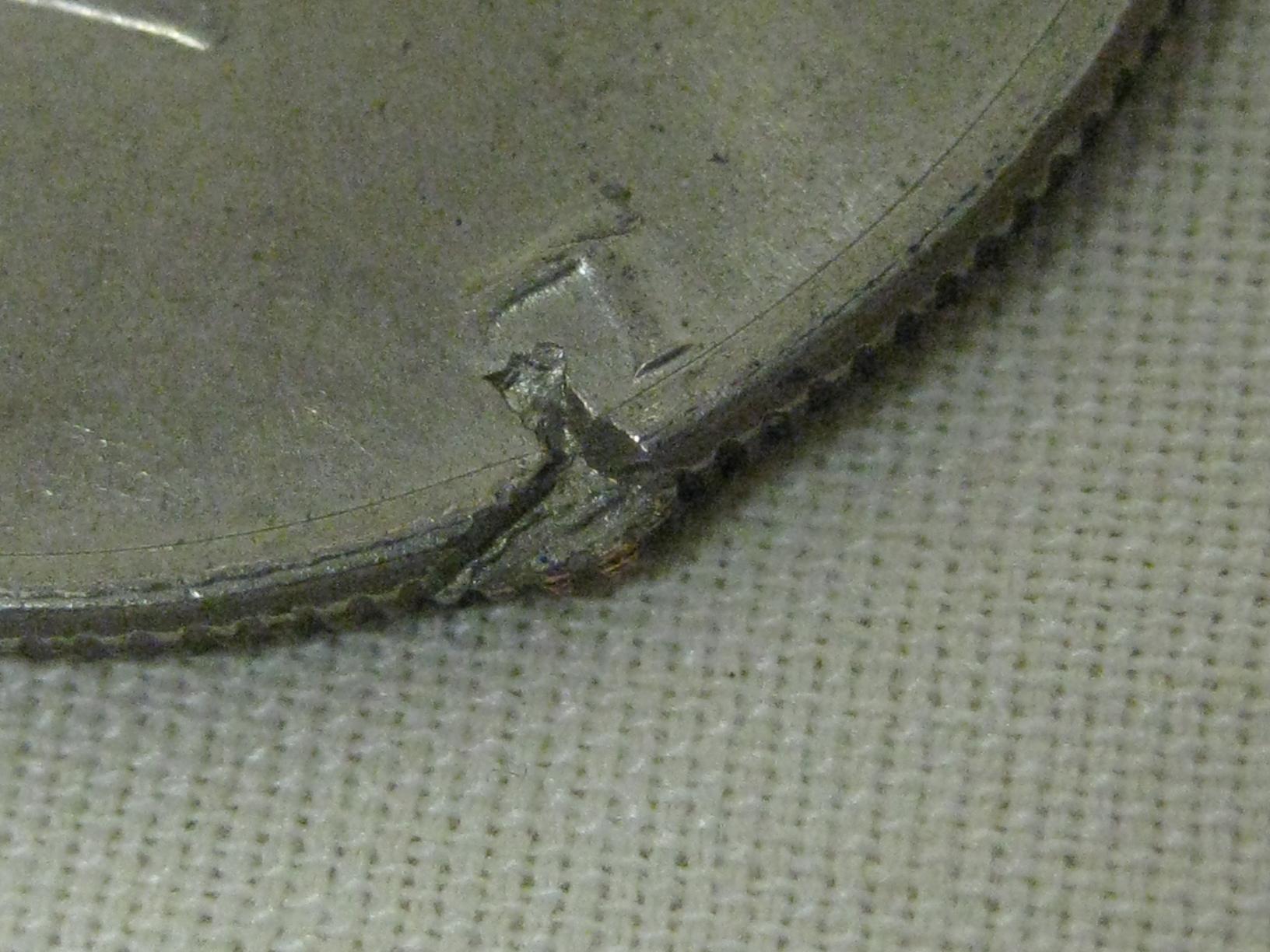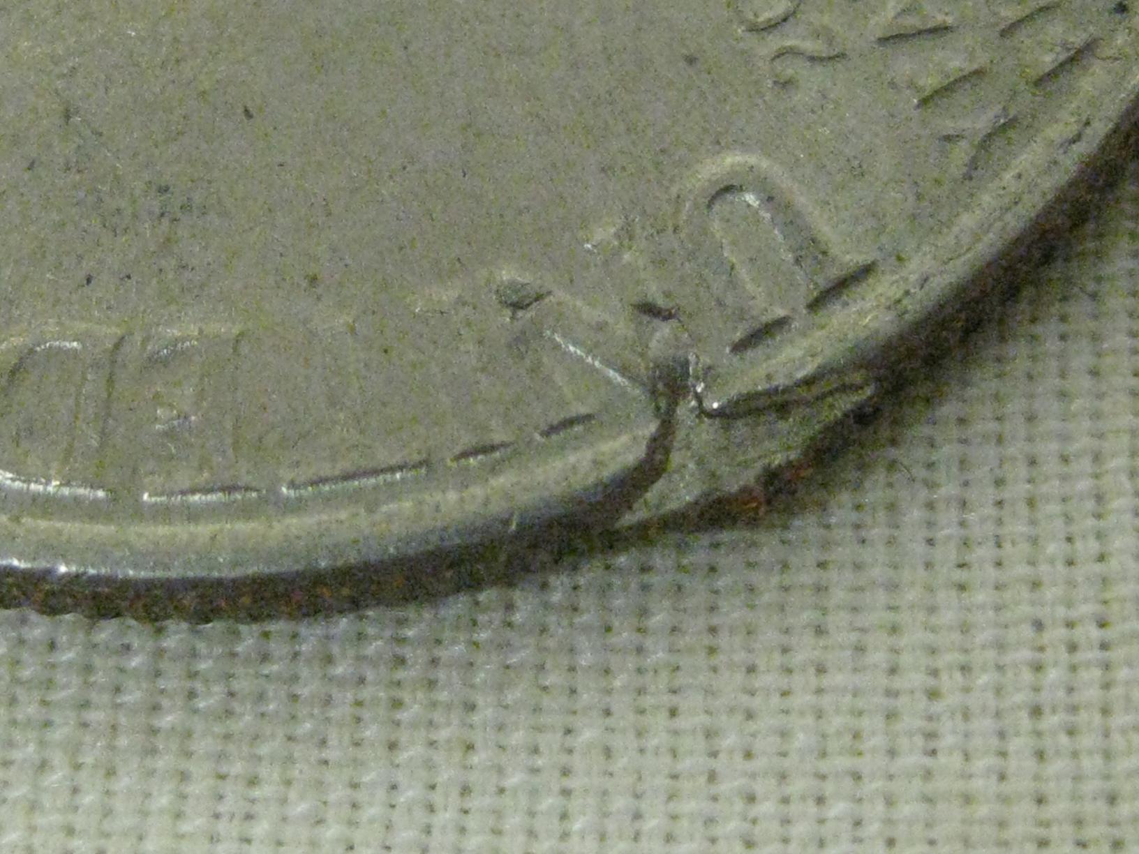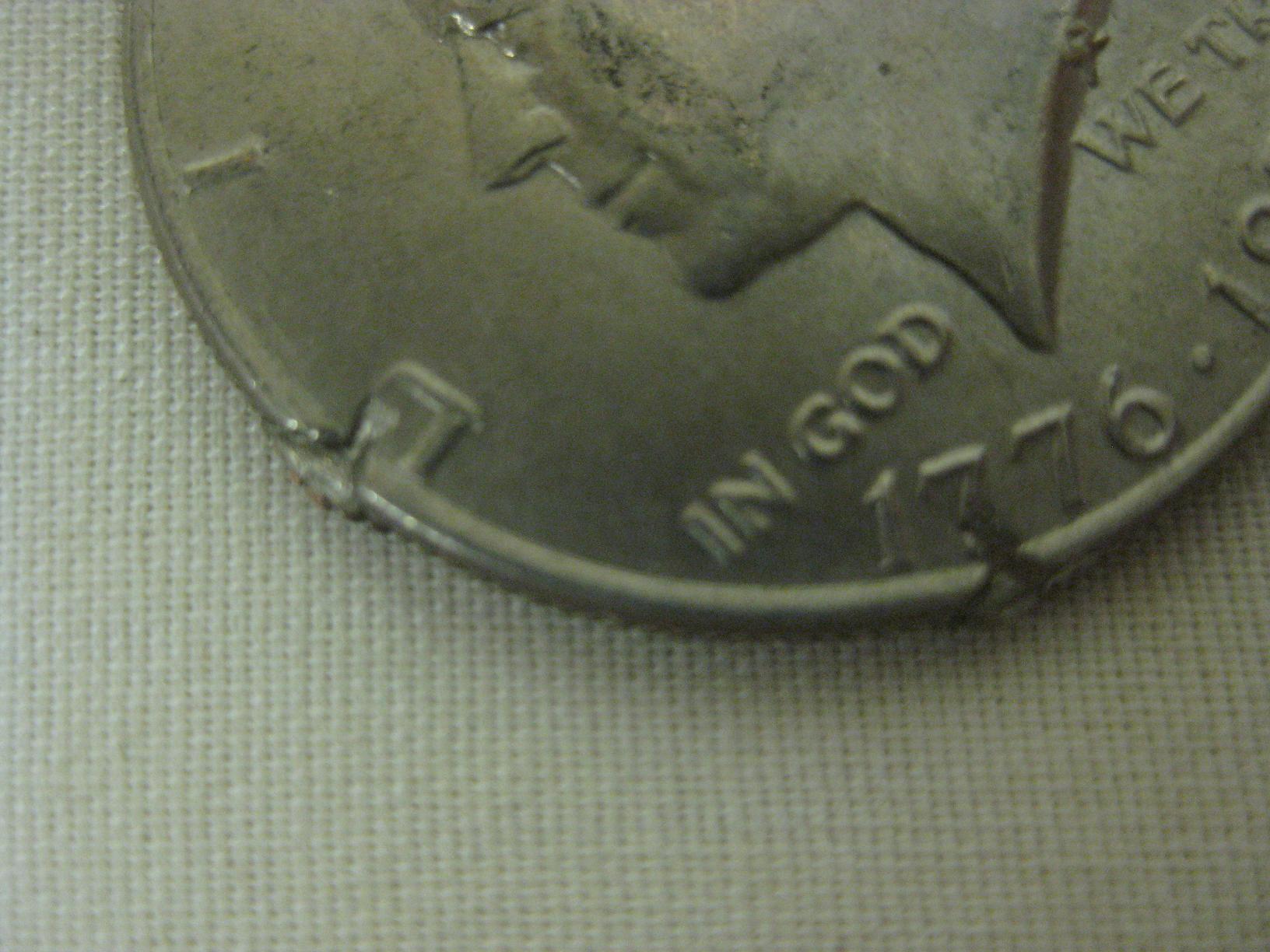 I posted this one once before, in a thread showing several odd coins I've found. I assumed it was just PMD, but several people, a few here and a few in person, have said they think it might NOT be. I am looking for more opinions and info. here are my pics. It was pointed out to me that the edges of the damage are very sharply defined, which makes it look like the striking happened after the damage. The reeding was also pointed out as indicative of it being struck after the damage, rather than before. Any other opinions? And if it IS a damaged planchet, rather than PMD, would this carry any premium for error collectors?
