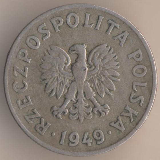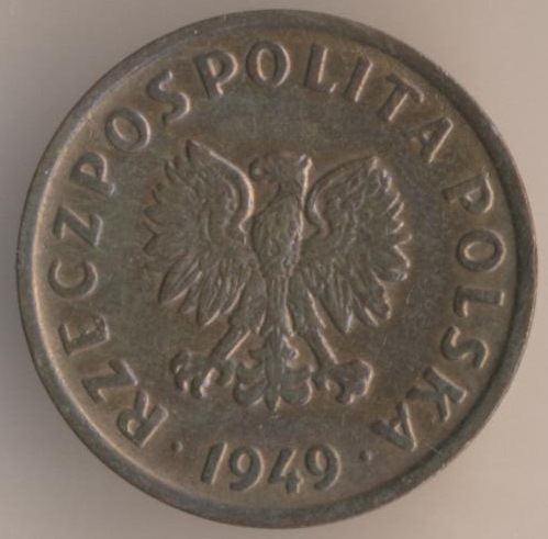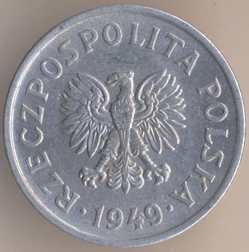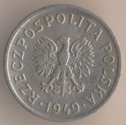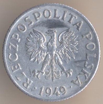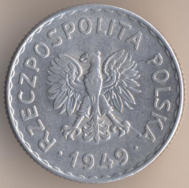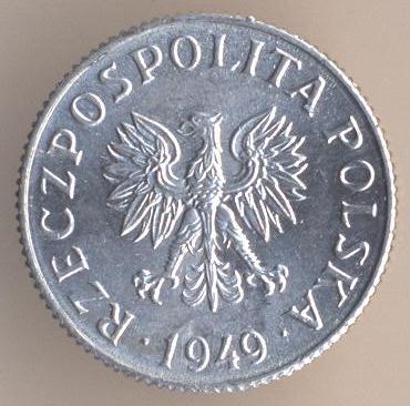 1 zloty 1949, aluminium, weight - 2,1 g., size - 25 mm, thickness - 1,83 mm, mintage - 43000000 pcs. Warsaw Mint. Single release only. Demonetized at January 1 1995.