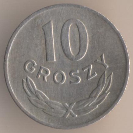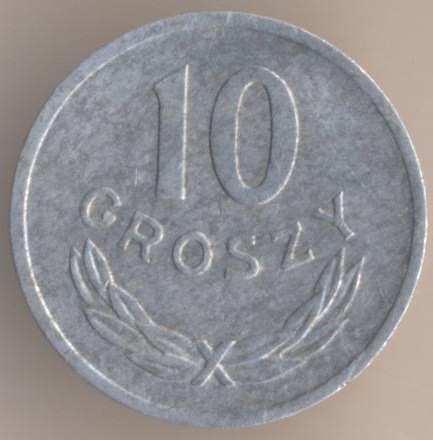 10 groszy 1973, aluminium, weight - 0,7 g., size - 17,6 mm, thickness - 1,27 mm, mintage - 80000000 pcs. Warsaw Mint. Coins of this type were released at 1961-63, 1965-1981, 1983 and 1985. Demonetized at January 1 1995.