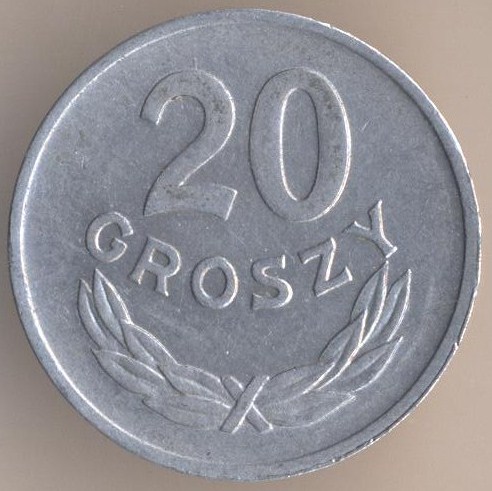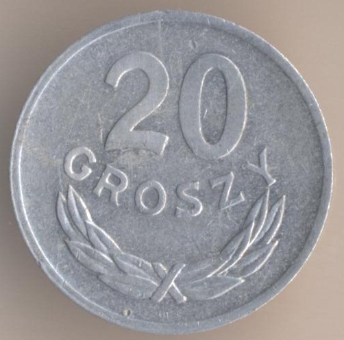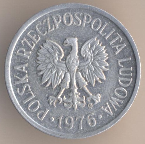 20 groszy 1976, aluminium, weight - 1 g., size - 20 mm, thickness - 1,4 mm, mintage - 100000000 pcs. Warsaw Mint. Coins of this type were released at 1957, 1961-63, 1965-1973, 1975-81, 1983 and 1985. Demonetized at January 1 1995.