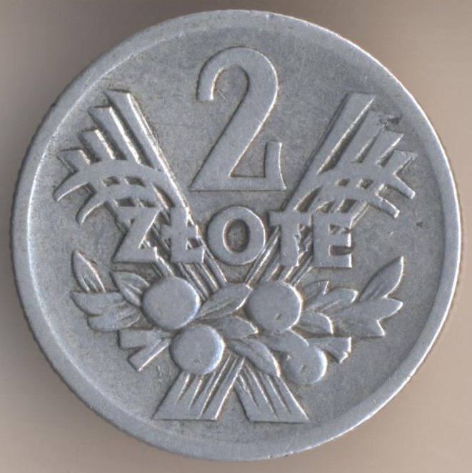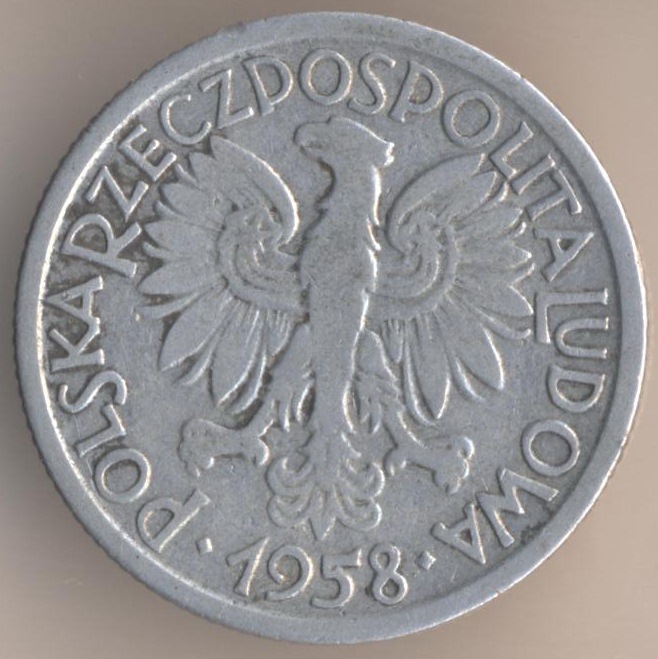 2 zlote 1958, aluminium, weight - 2,7 g., size - 27 mm, thickness - 2,1 mm, mintage - 82640000 pcs. Coins of this type were released at 1958-60 and 1970-74.
