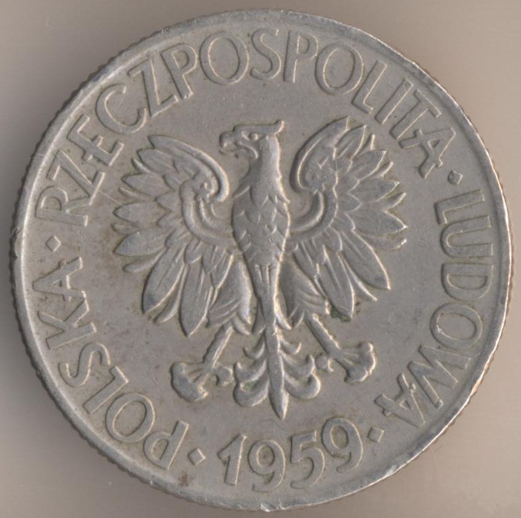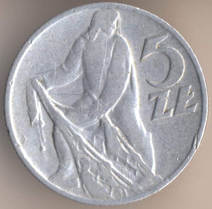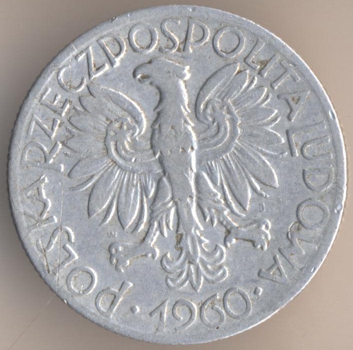 5 zlotych 1960, aluminium, weight - 3,45 g., size - 29 mm, thickness - 2,56 mm, mintage - 16300999 pcs. Engraver: Jozef Goslawski. Coins of this type were released at 1958-60, 1971 and 1973-74.
