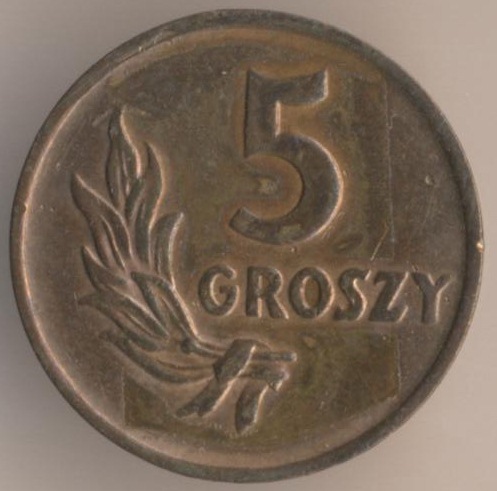 5 groszy 1949, bronze, weight - 3 g., size - 20,2 mm, thickness - 1,3 mm mintage - 300000000 pcs. Basel Mint (Switzerland) Single release only.