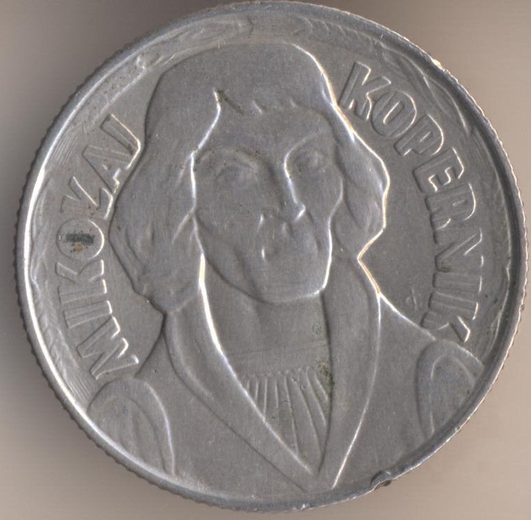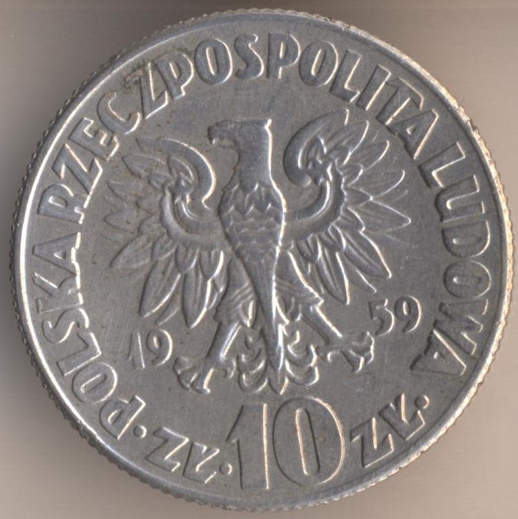 10 zlotych 1959, copper-nickel, weight - 12,9 g., size - 31 mm, thickness - 2,2 mm, mintage: 12559000 pcs. "Mikolaj Kopernik". Engraver: Jozef Goslawski. Coins of this type were released at 1959 and 1965.