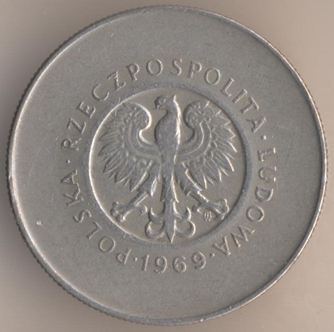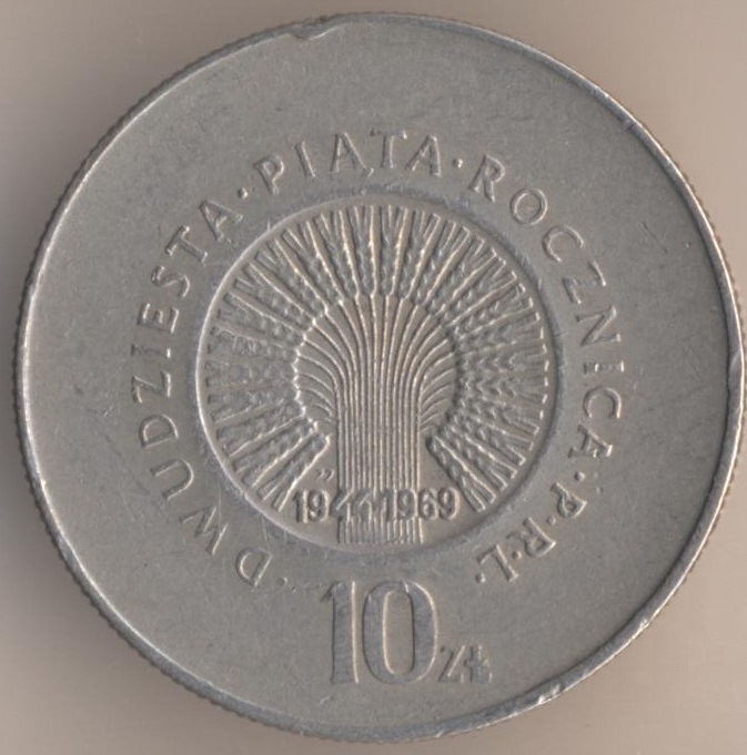 10 zlotych 1969, copper-nickel, weight - 9,5 g., size - 28 mm, thickness - 2 mm, mintage: 2000000 pcs. "25th Anniversary - Peoples republic". Warsaw Mint. Single release only.