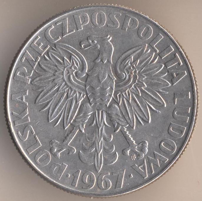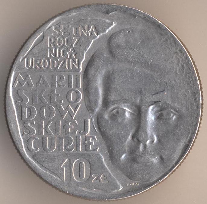 10 zlotych 1967, copper-nickel, weight - 9,5 g., size - 28 mm, thickness - 2 mm, mintage: 2000000 pcs. "Centennial - Birth of Marie Sklodowska Curie". Warsaw Mint. Single release only.