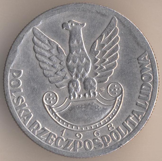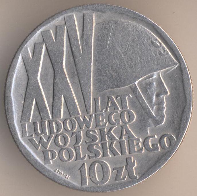 10 zlotych 1968, copper-nickel, weight - 9,5 g., size - 28 mm, thickness - 2 mm, mintage - 2000000 pcs. "25th Anniversary - People's Army". Warsaw Mint. Single release.