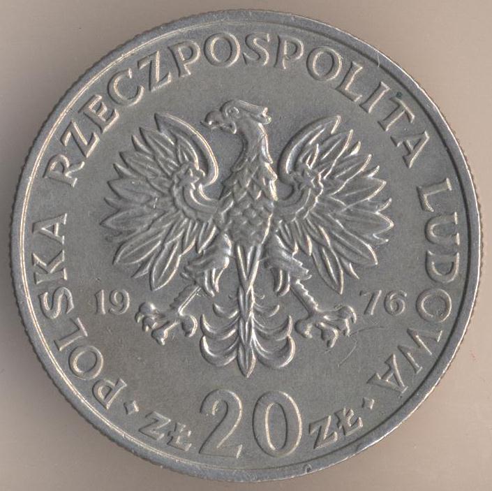20 zlotych 1976, copper-nickel, weight - 10,15 g., size - 28,8 mm, thickness - 2,11 mm, mintage - 30000000 pcs. "Life of Marceli Nowotko". Warsaw Mint. Coins of this type were released at 1974-77 and 1983.