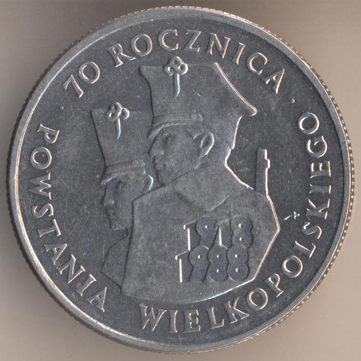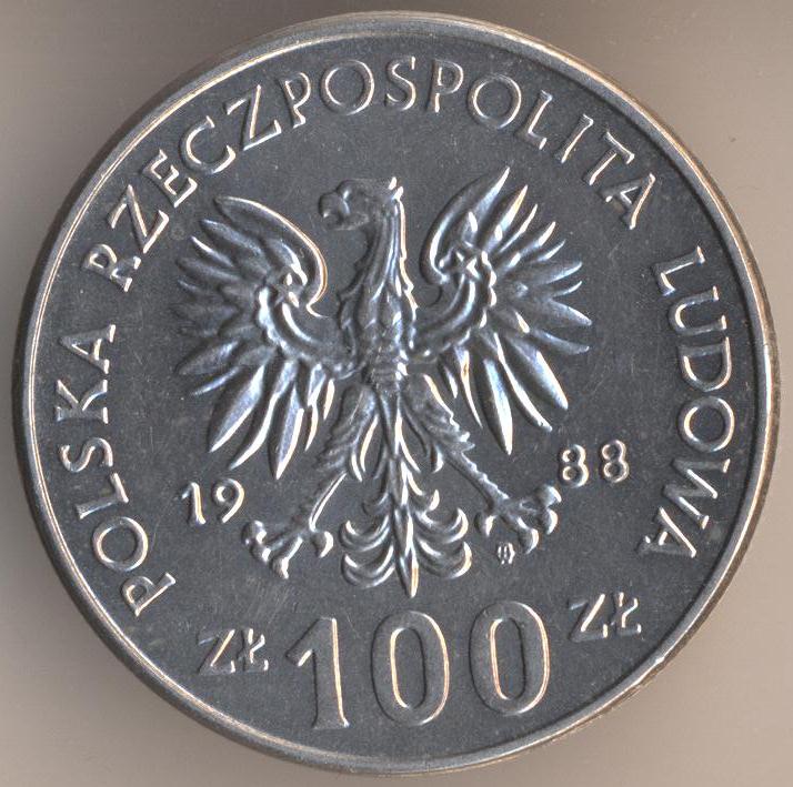 100 zlotych 1988, copper-nickel, weight - 10,8 g, size - 29 mm, thickness - 2,1 mm, mintage - 2513000 pcs. Warsaw Mint. "70th Anniversary of Greater Poland Uprising". Single release only.