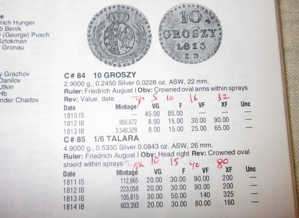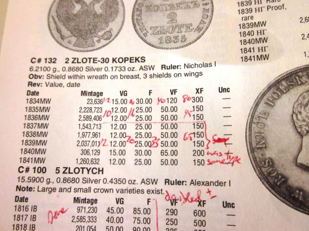 Hello coin people. Last weekend, I got this 1800-1900 Krause catalog for $20 from a dealer. The copyright on this 6th edition is 2006 so it is not the most recent Krause book. The previous owner of this book had made notes in the Poland coin section. My photos depict how the Krause prices for Poland coins had sky-rocketed into the 2006 edition! I wonder how these Poland coin prices compare to the newest Krause book. If you have the latest book, please let me know how the latest prices compare to those in my photos.