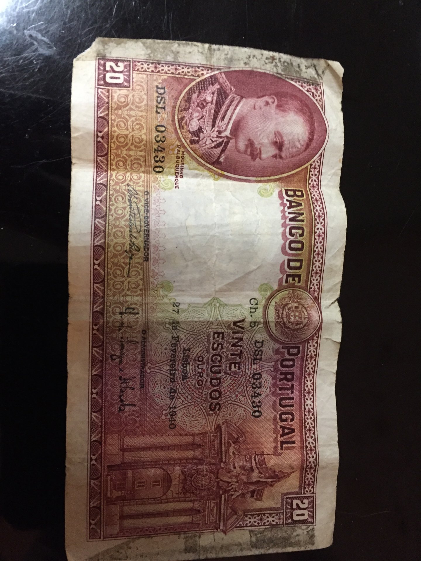 Just did a quick Google search and found one just like yours (except nicer) on eBay. Try Googling Banco de Portugal $20 http://www.ebay.com/itm/Portugal-P-143-20-Escudos-1940-F-VF-/332168230258