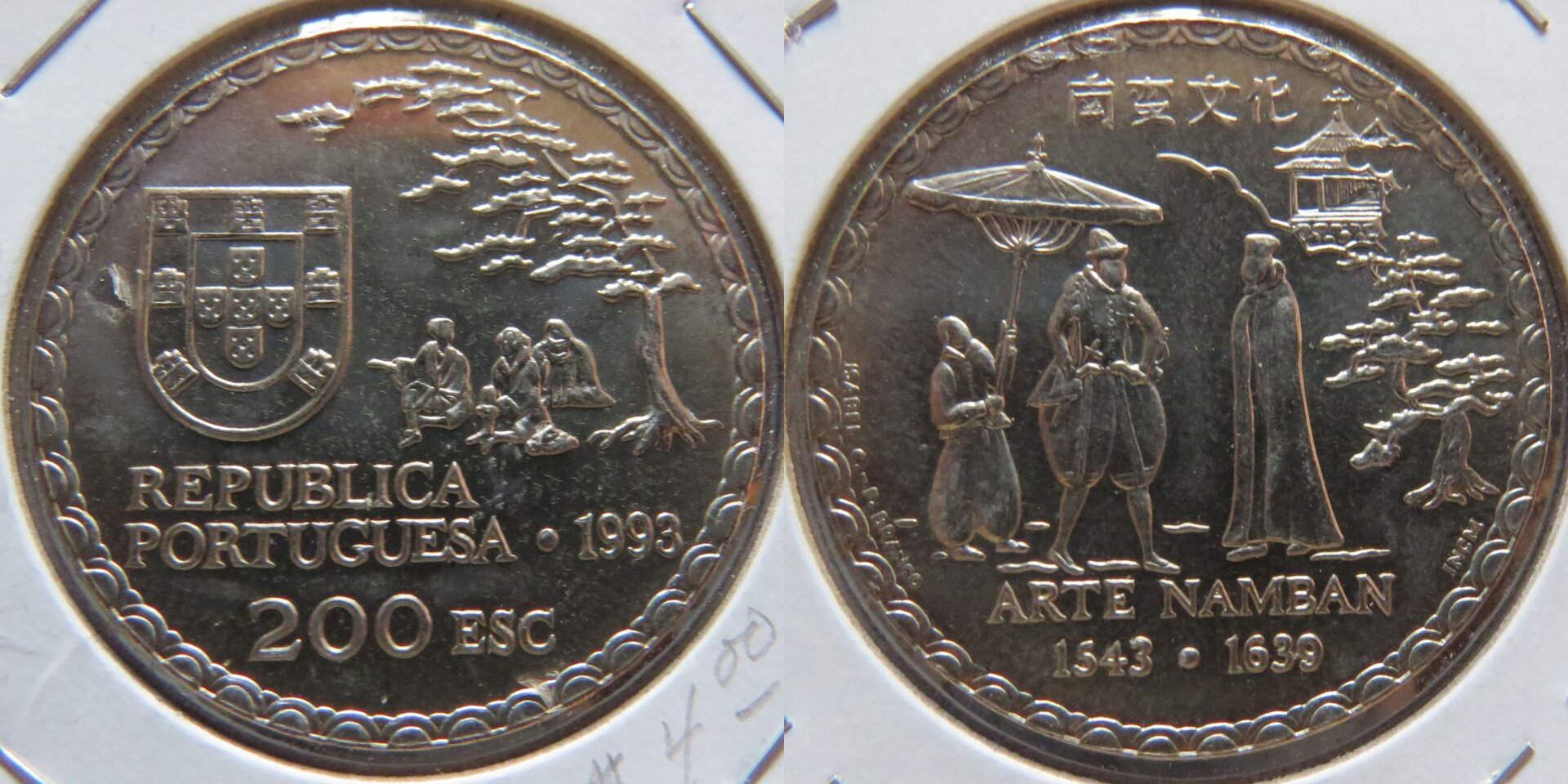 I'm not usually into modern commemoratives, but the Japanese theme intrigued me. Portugal, 1993, 200 Escudos, 450th Anniversary of Nanban Art. Portuguese traders made a big, if short-lived, influence on Japanese art after their arrival in 1493. Under the "Sakoku" system of the Tokugawa Shogunate, most Western influences were stamped out (to the great detriment of local Christian converts). Trade was limited to a few isolated southern ports, mostly under the Dutch as they were non-Catholic and seen as less of a threat.